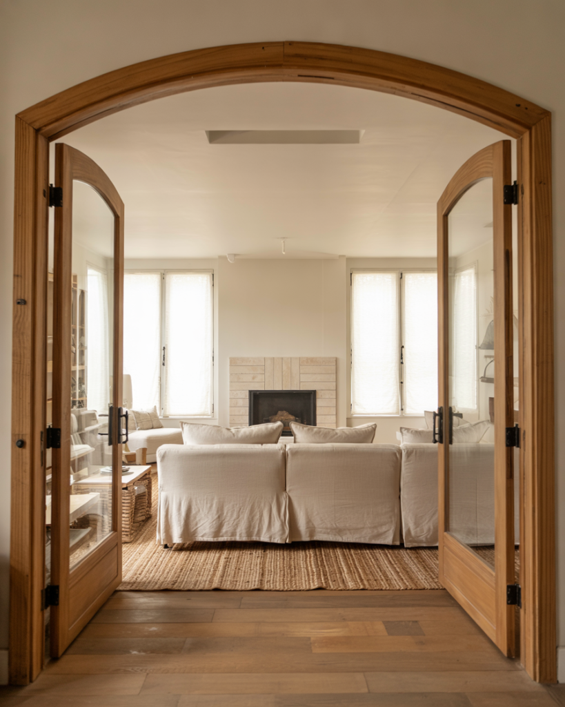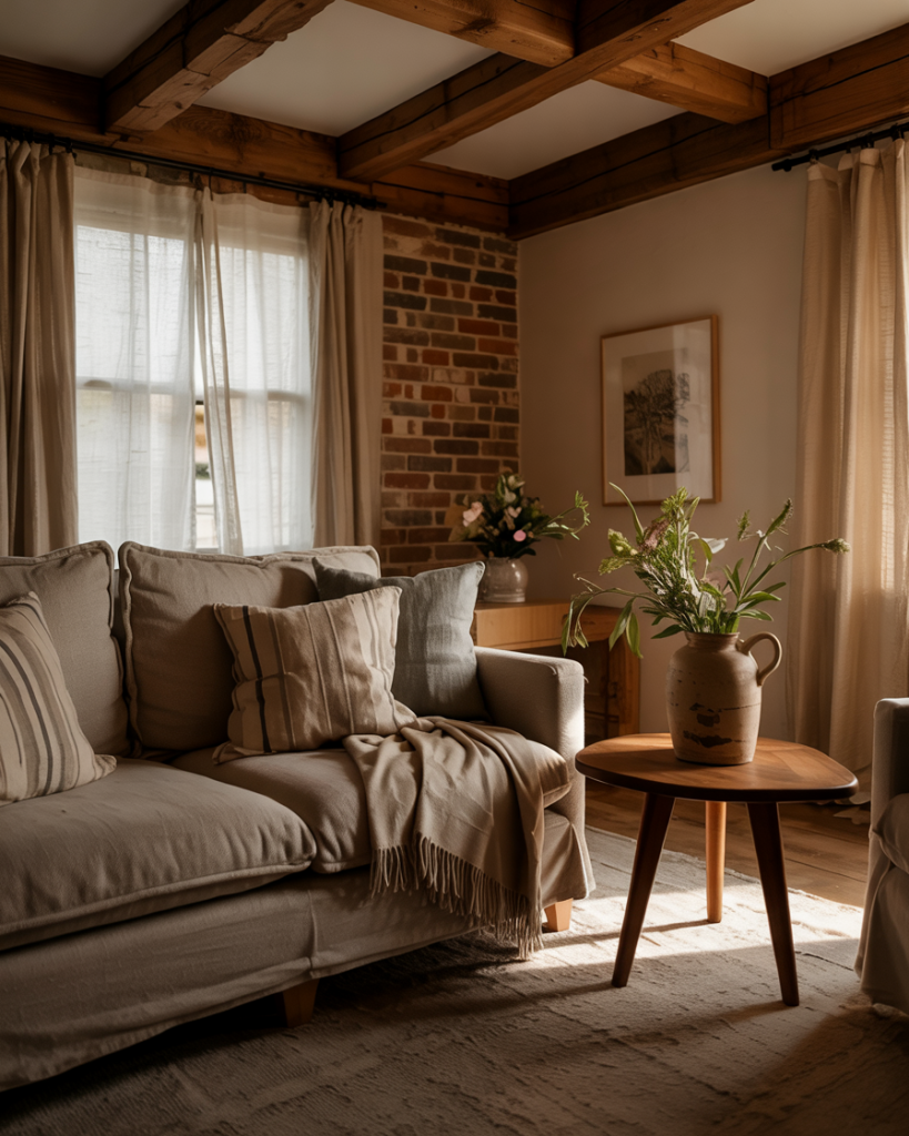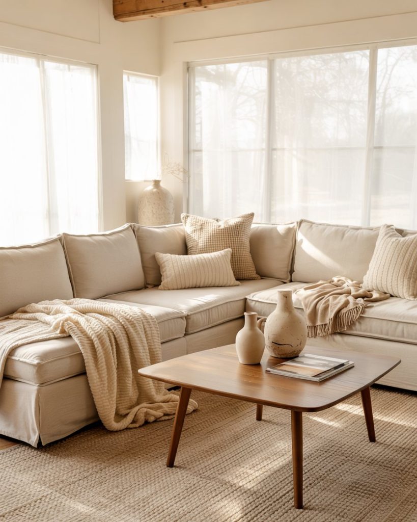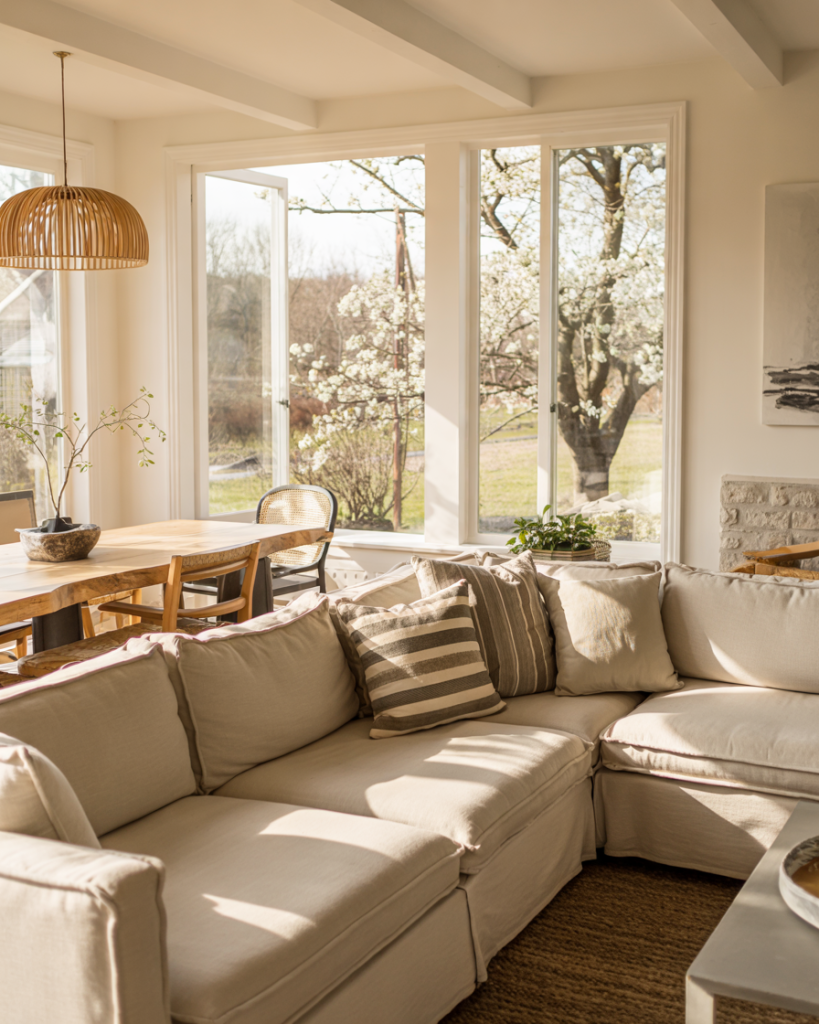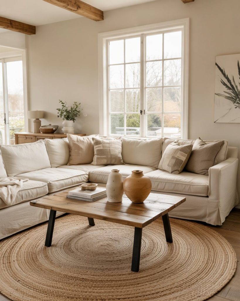 Slipcovered furniture is a farmhouse classic for a reason—it’s washable, relaxed, and visually soft. White, oatmeal, or stone-colored covers pair with woven throws and layered rug textures for effortless comfort. This style works especially well for families, pets, and high-traffic rooms, proving that beautiful spaces can still be lived in fully.