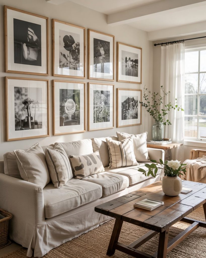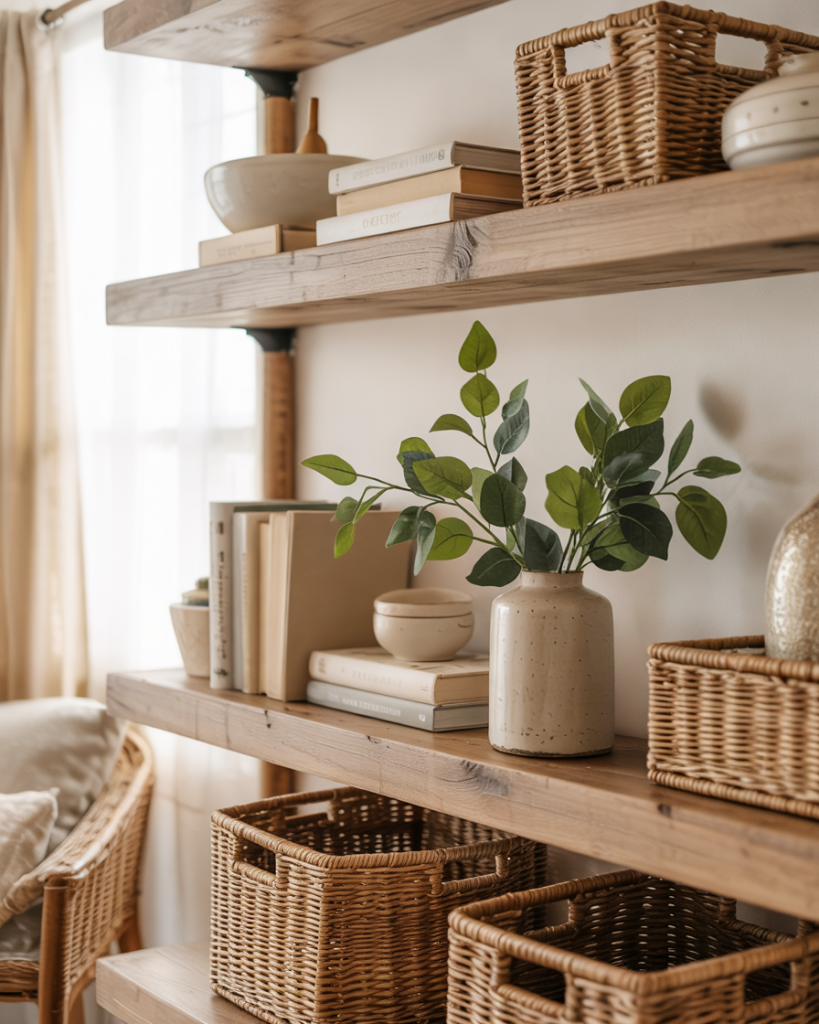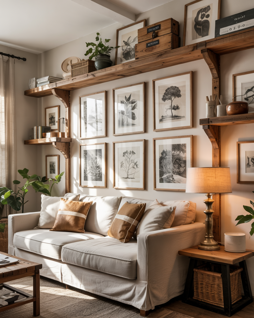 Instead of one big art piece, try long wall-mounted shelves filled with books, vases, and framed photos. This brings flexible decor without committing to nails in the wall. It’s a favorite trick on sites like Apartment Therapy because it blends storage with style. Neutral colors and natural wood keep the display calm and farmhouse-friendly.