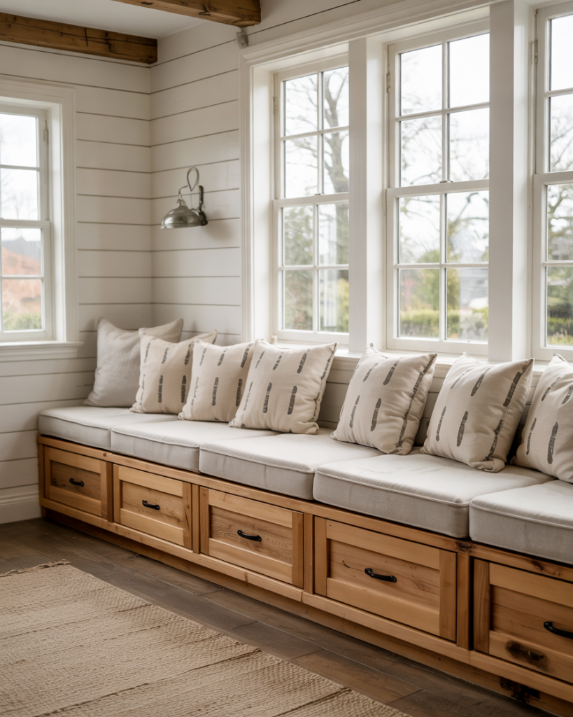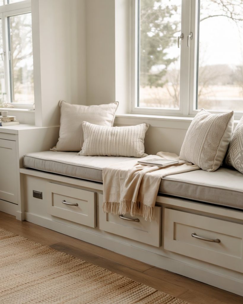 Built-in seating under windows or along walls adds charm and function. Add storage drawers, soft cushions, and cozy throw pillows in earthy colors. These benches create inviting reading nooks and help smaller rooms feel bigger, perfect for both houses and apartment spaces where every inch matters.
