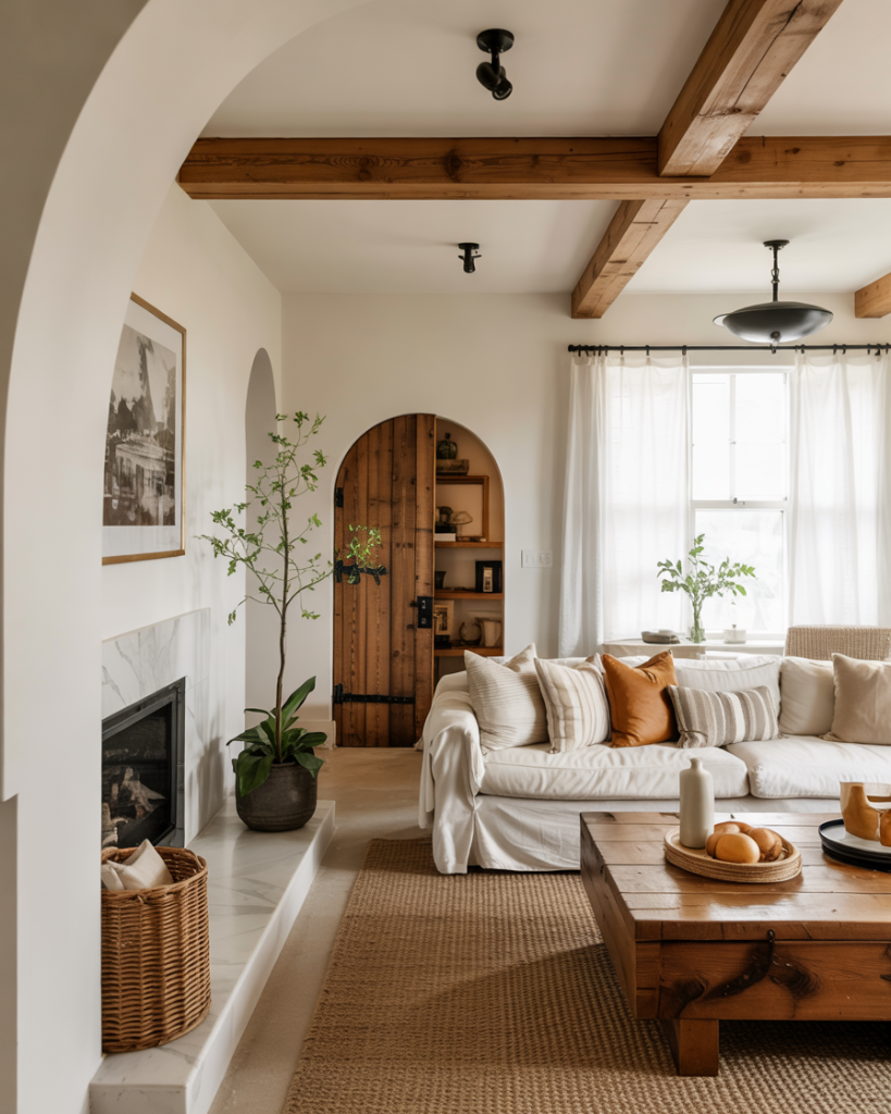 Adding rustic and organic details gives your space the handmade charm that defines farmhouse living. Reclaimed wood shelves, vintage consoles, and distressed finishes bring soul and authenticity. Pairing weathered oak beams with mid-century modern chairs creates a perfect harmony of old and new. This look thrives in open layout spaces, where natural materials shine under soft light.