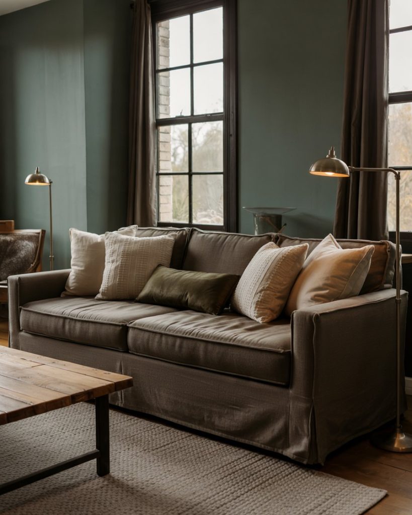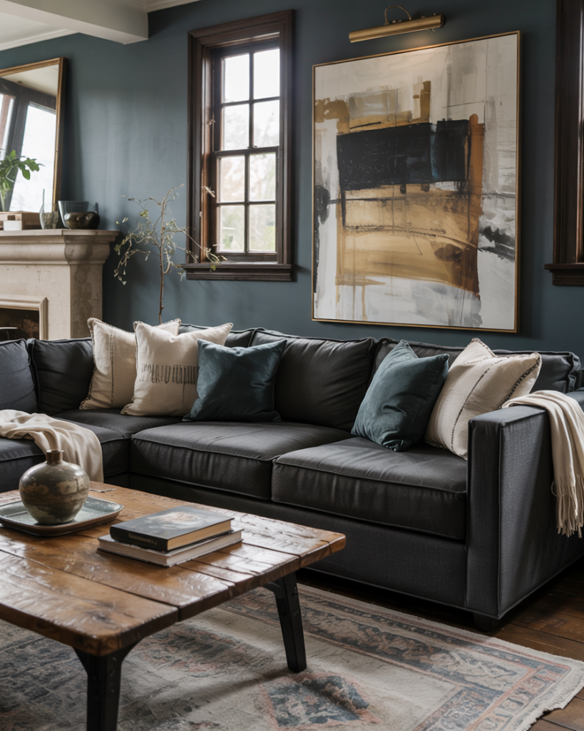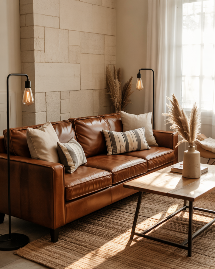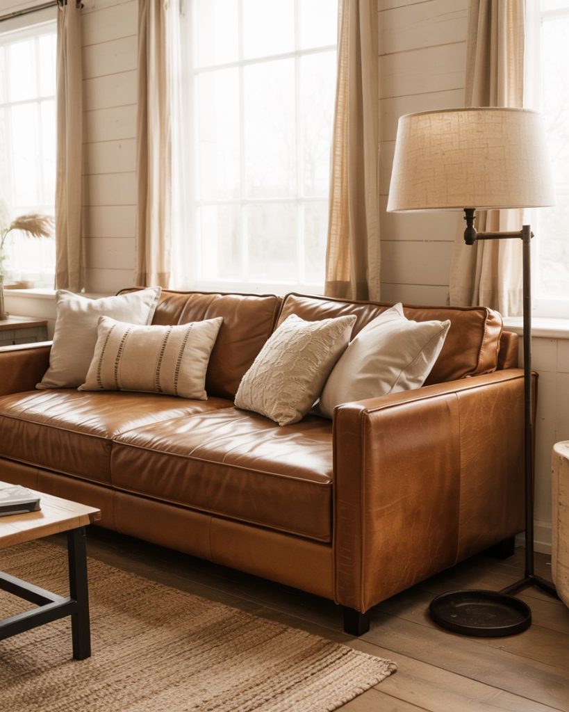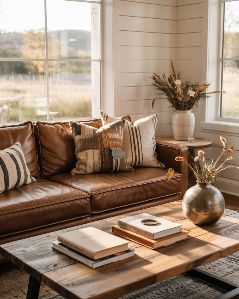 Combining black metal and brown couch leather gives balance between warmth and sophistication. Metal-framed coffee tables or matte-black wall decor elements add bold contrast. This palette of earth and ink grounds lighter tones in your color schemes, keeping the space mature yet relaxed. It’s a timeless, effortlessly chic farmhouse move.
