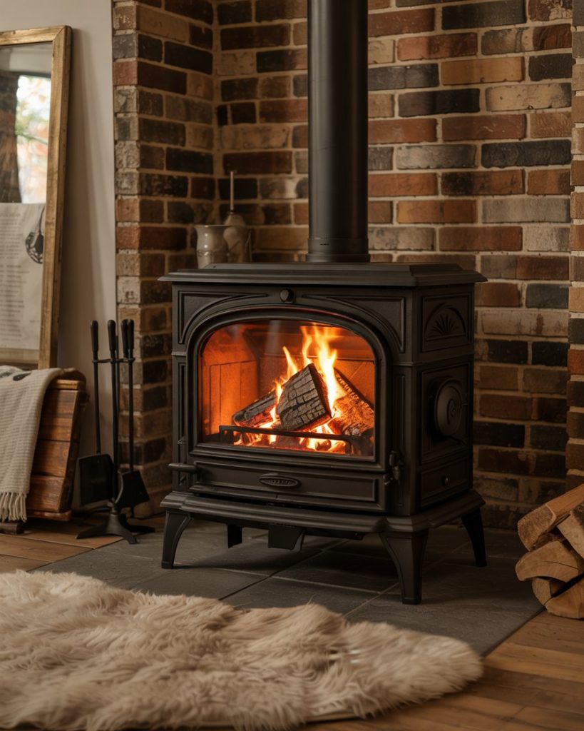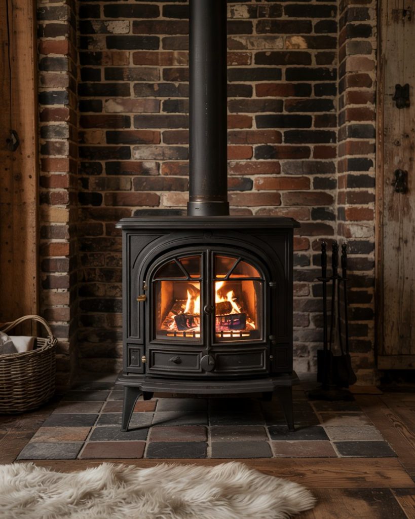 Instead of a full mantel, a compact wood or gas stove brings the cozy feel of fireplaces to tight spaces. Cast iron black stoves look beautiful against brick or stone, especially in cabins or small living rooms. Add a stack of logs, soft lighting, and a wool rug for a storybook farmhouse moment.
