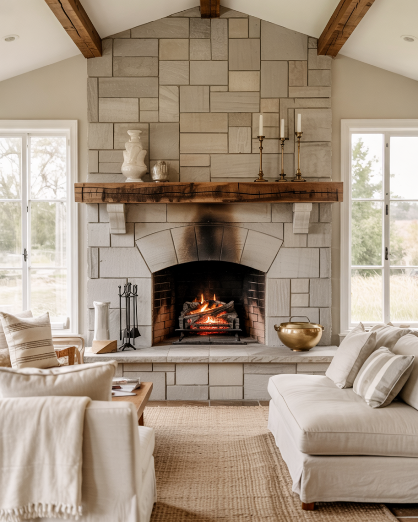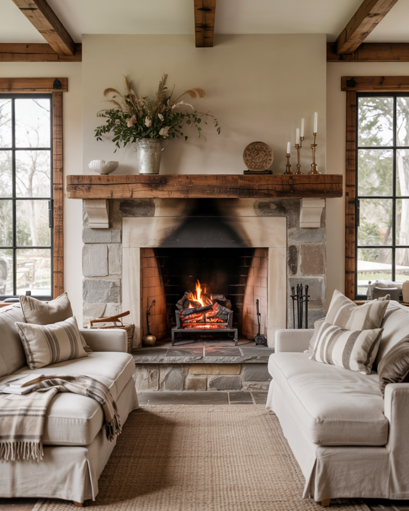 A farmhouse home feels complete with glowing fireplaces as its center. Whether classic stone, brick, or painted black, the hearth draws people together. Add simple wall decor, rustic mantels, and seasonal decor ideas like candles or greenery for warmth and personality. The fireplace connects design and emotion, reminding us that good inspiration always starts with comfort.
