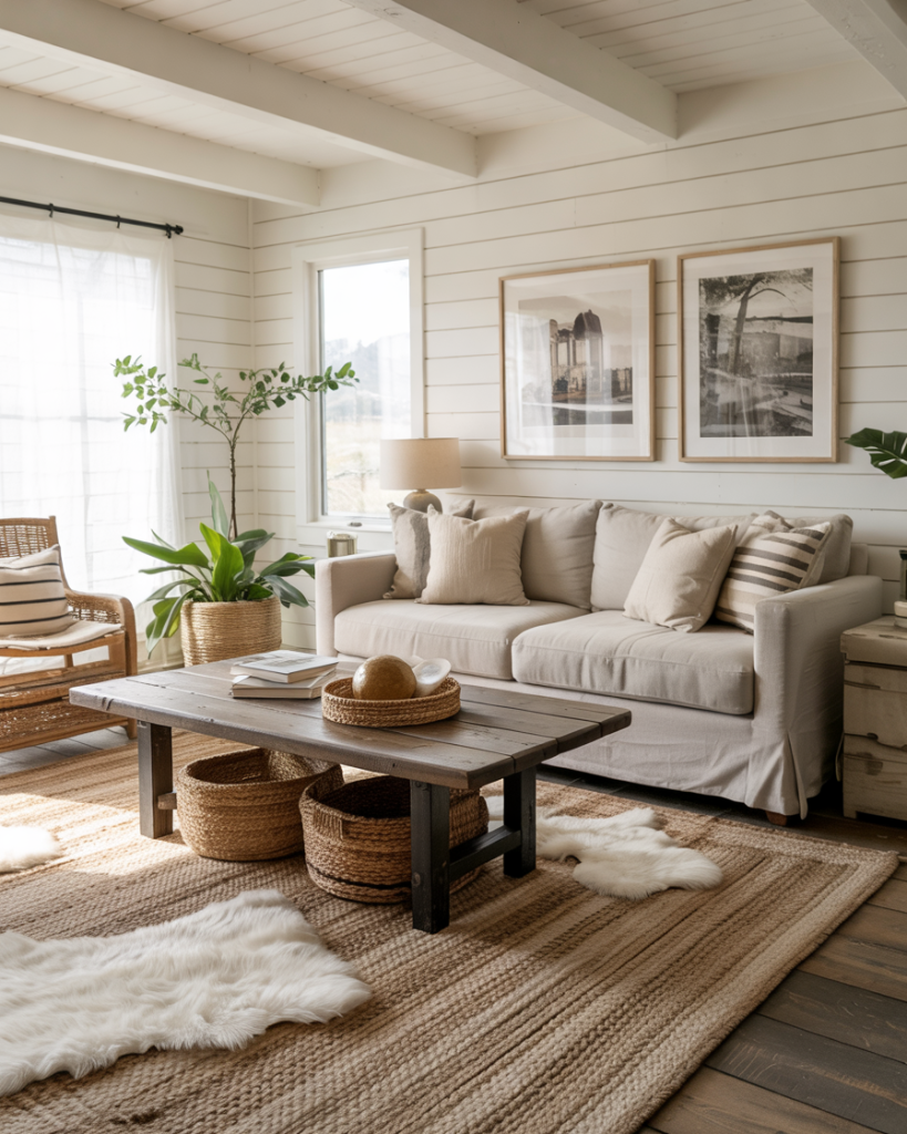 A modern farmhouse living room begins with a cozy foundation, and with that, consider neutral tones, warm lighting, and inviting furnishings. A cozy foundation allows for decor flexibility, while a soft grey or brown couch, linen drapes, and woven baskets can establish a calm base for later evolving ideas. The open layout keeps the space feeling airy, while layered textures in the rugs bring depth and warm the room. This is where simplicity meets heart.