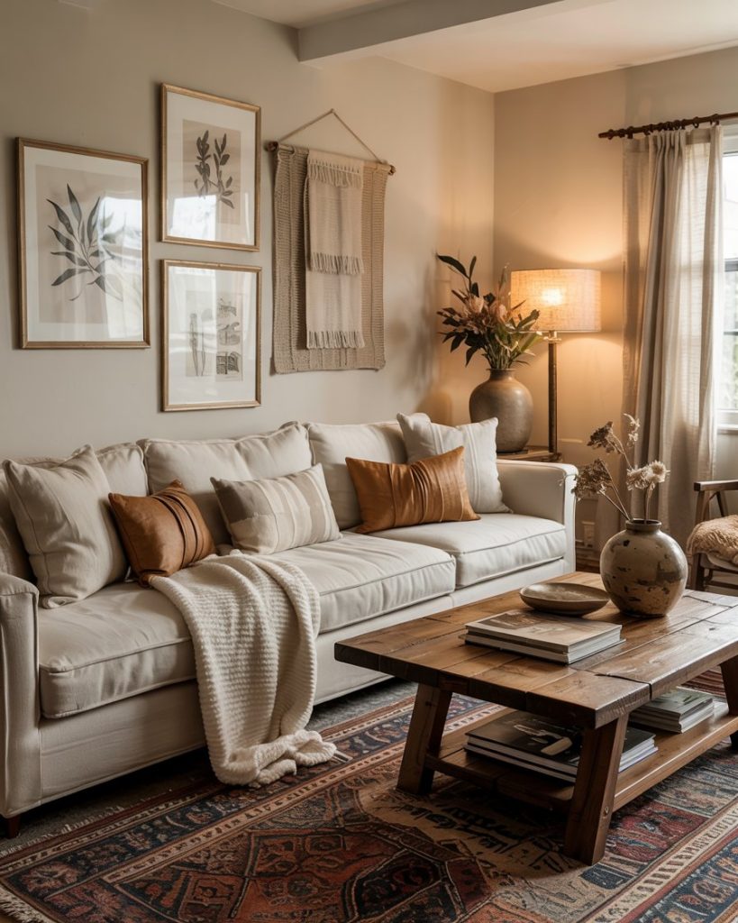 Even a small apartment can embrace this look. Focus on vertical wall decor, floating shelves, and compact furniture with natural finishes. Add cozy textiles, rug layers, and warm lighting to create depth without clutter. This scaled-down approach keeps the inspiration alive while fitting urban lifestyles beautifully.