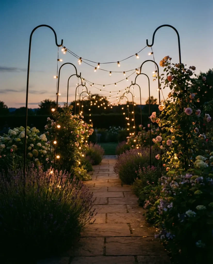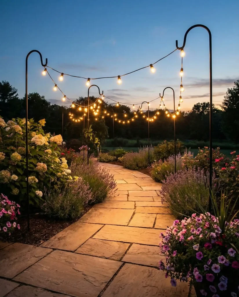 Shepherd’s hooks create portable anchor points that let you design flexible string light configurations without permanent installations. Space them along garden paths or around patio edges, then drape lights between hooks to form elegant arches. This way to hang lights works beautifully for renters or anyone who wants to reconfigure their outdoor lighting seasonally. The hooks push easily into soft soil and can be relocated as landscaping changes throughout the year.