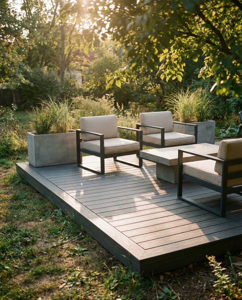 Where it works best: Urban rowhomes in cities like Philadelphia, Baltimore, or D.C., where backyards are more like courtyards. Also great for side-yard installations where you wouldn’t normally think to build a deck. Consider running the boards perpendicular to the house to create visual width—horizontal lines make narrow spaces feel wider. Skip bulky furniture; folding chairs and nesting tables let you adjust based on whether you’re solo with a book or hosting a few friends.