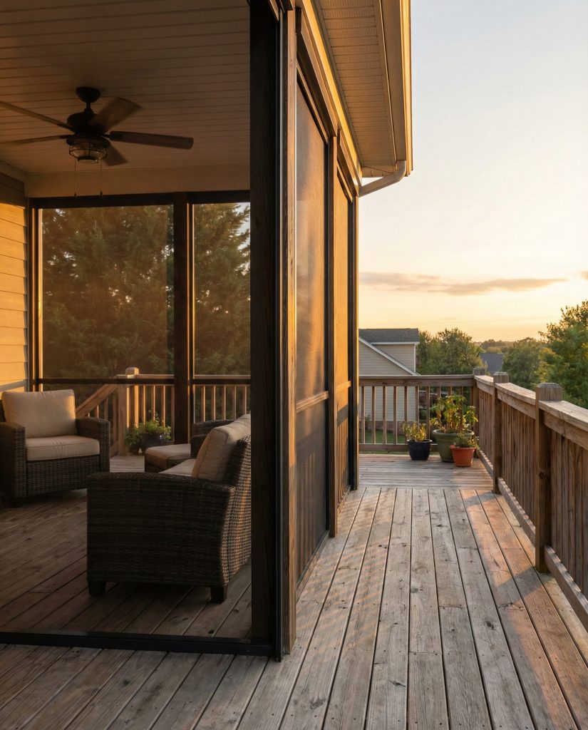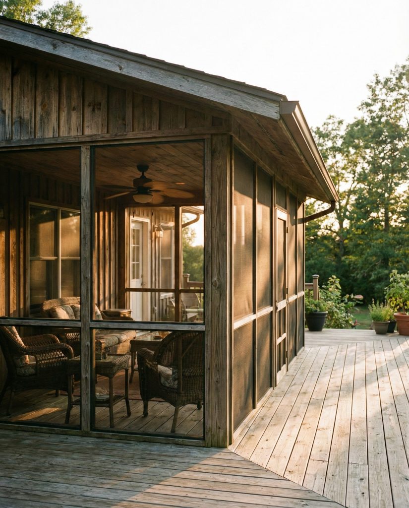 Expert insight: Frame the screened section first, then build the open deck to match the height exactly—you don’t want a step up or down between the two spaces. Use heavy-duty screening (20×20 mesh or better) to resist tears from pets or stray branches. Consider a retractable screen door instead of a traditional hinged one; it’s easier for carrying food and drinks in and out, plus it closes automatically so you’re not constantly shooing bugs away from an open door.