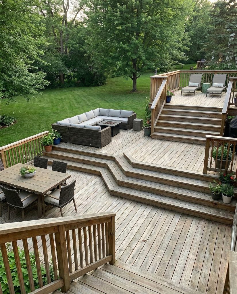 If you have a large backyard, a single-plane deck can feel like a missed opportunity. Creating multiple levels—even just a step down of 8-10 inches—defines separate zones without needing walls or dividers. One level might host your dining table, another your lounge seating, and a third could be dedicated to a fire pit or hot tub. The elevation changes add visual interest and make the space feel more dynamic, almost like indoor rooms that flow into each other.