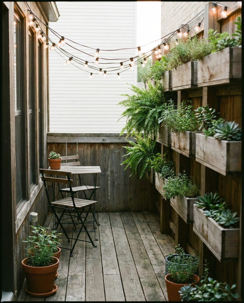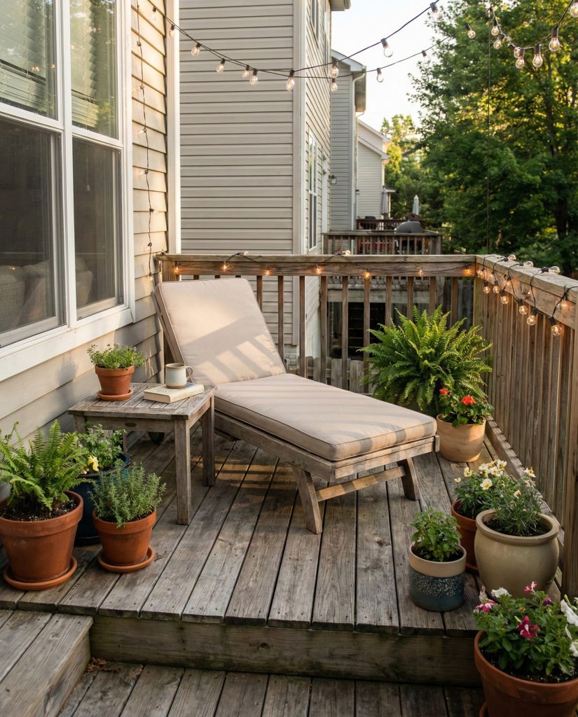 A narrow deck along the back of a townhouse or condo can still deliver major impact. Even a 6-8 foot depth gives you room for a bistro set, some planters, and a string of lights. The trick is treating it like a hallway rather than a room—arrange furniture against the house wall to keep the pathway clear. Long, skinny benches with storage underneath work beautifully here, and vertical gardens or hanging plants draw the eye up instead of emphasizing the limited width.