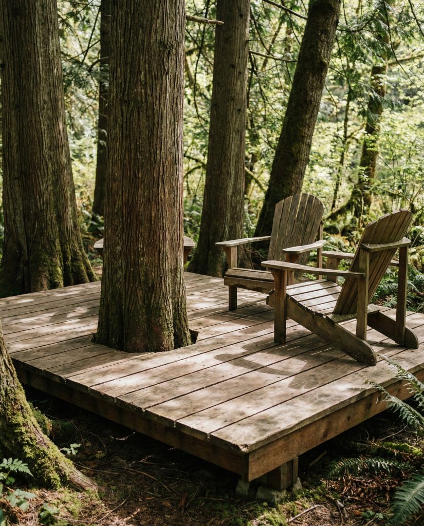 Building a deck in a wooded lot means working with trees, not against them. Instead of clearing every trunk in sight, consider leaving a tree or two growing through the deck itself—it creates an enchanting, treehouse vibe and provides natural shade. Use the existing canopy to your advantage by skipping a roof and letting branches create dappled light. Stain the wood in earthy tones that blend with bark and fallen leaves, and keep furniture simple so the forest remains the star.