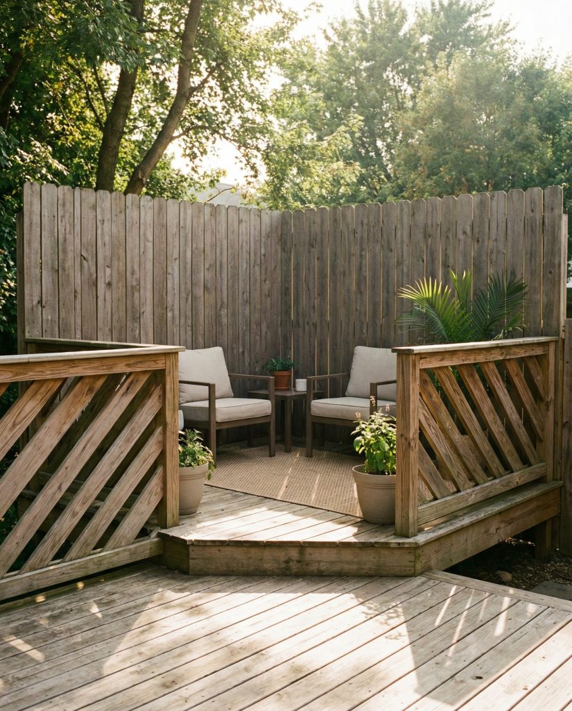 A couple on my street built a corner deck because their side yard was unusable otherwise—too narrow for anything but a walkway, but perfect when they extended it into the back corner. Now it’s their favorite spot for morning coffee, shielded from neighbors’ views and catching early sun that the main patio never gets. They strung a hammock across the diagonal, and it’s become the most-used part of their whole outdoor setup.