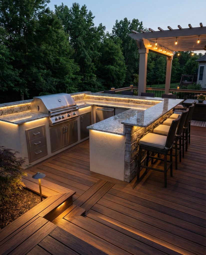 A dream deck for serious entertainers includes a full outdoor kitchen—built-in grill, sink, refrigerator, and ample counter space for prep work. This setup keeps the cook in the mix rather than isolated indoors while everyone else enjoys the party. Decor matters here: stainless appliances, stone or tile counters, and maybe a pergola overhead with pendant lights. It’s a significant investment, but for families who practically live outside from April to October, it fundamentally changes how you use your home.