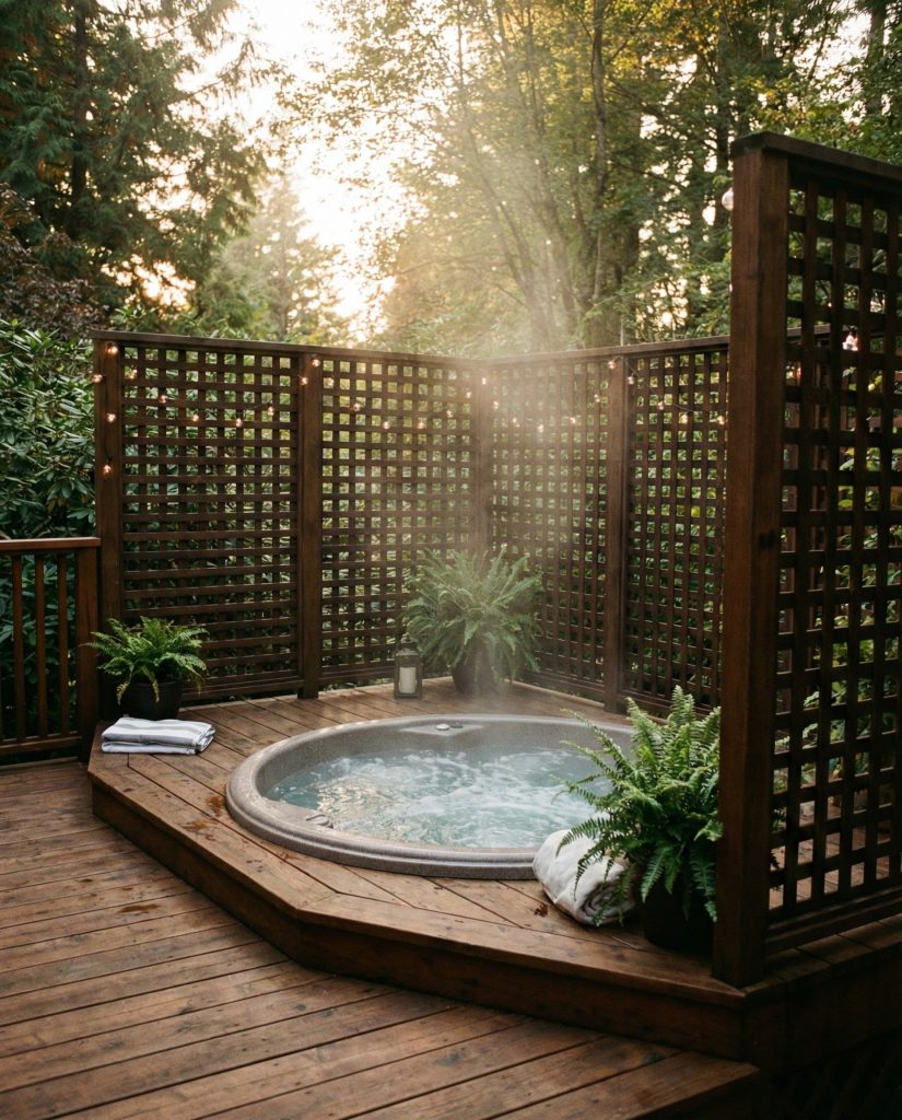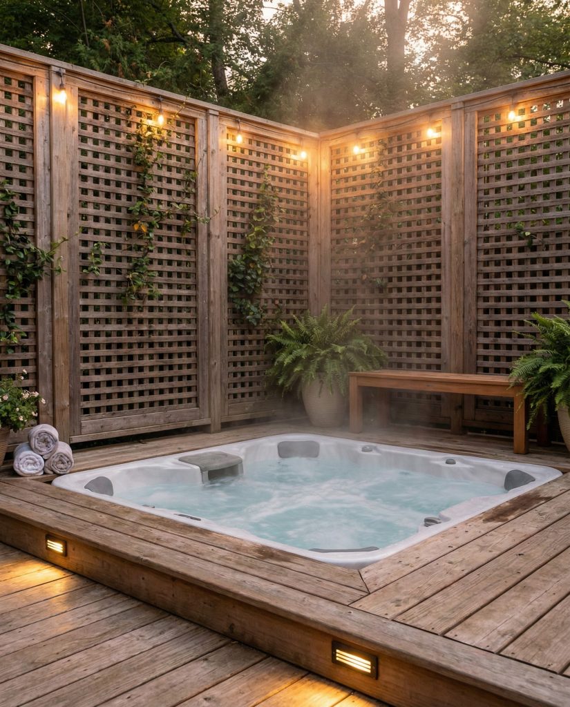 Dedicating a section of your deck to a hot tub requires planning for weight, access, and privacy. A typical 6-person hot tub filled with water and people weighs around 4,000-5,000 pounds, so the framing underneath needs beefing up—closer joist spacing and often doubled or tripled joists. Surround the tub with tall planters, lattice panels, or a three-sided pergola to create a sense of enclosure. You don’t necessarily need full walls, just enough screening so you feel comfortable relaxing without feeling like you’re on display to the neighbors.