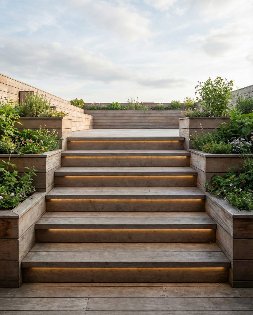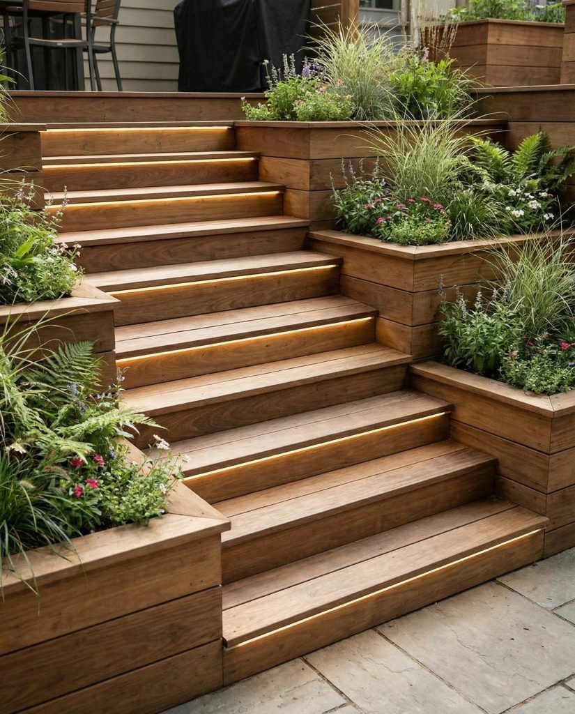 Most decks need stairs, so why not make them special? Wide, generous steps that wrap around a corner or cascade down in a fan shape turn a functional necessity into a focal point. Extra-deep treads (14-16 inches instead of the standard 11) can double as casual seating during parties. Some homeowners add built-in planters at each landing or LED strip lighting under each nose for safety and ambiance. The stairs become part of the deck’s personality, not just a means to an end.