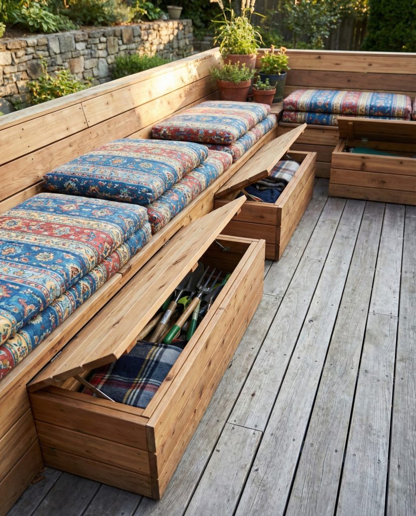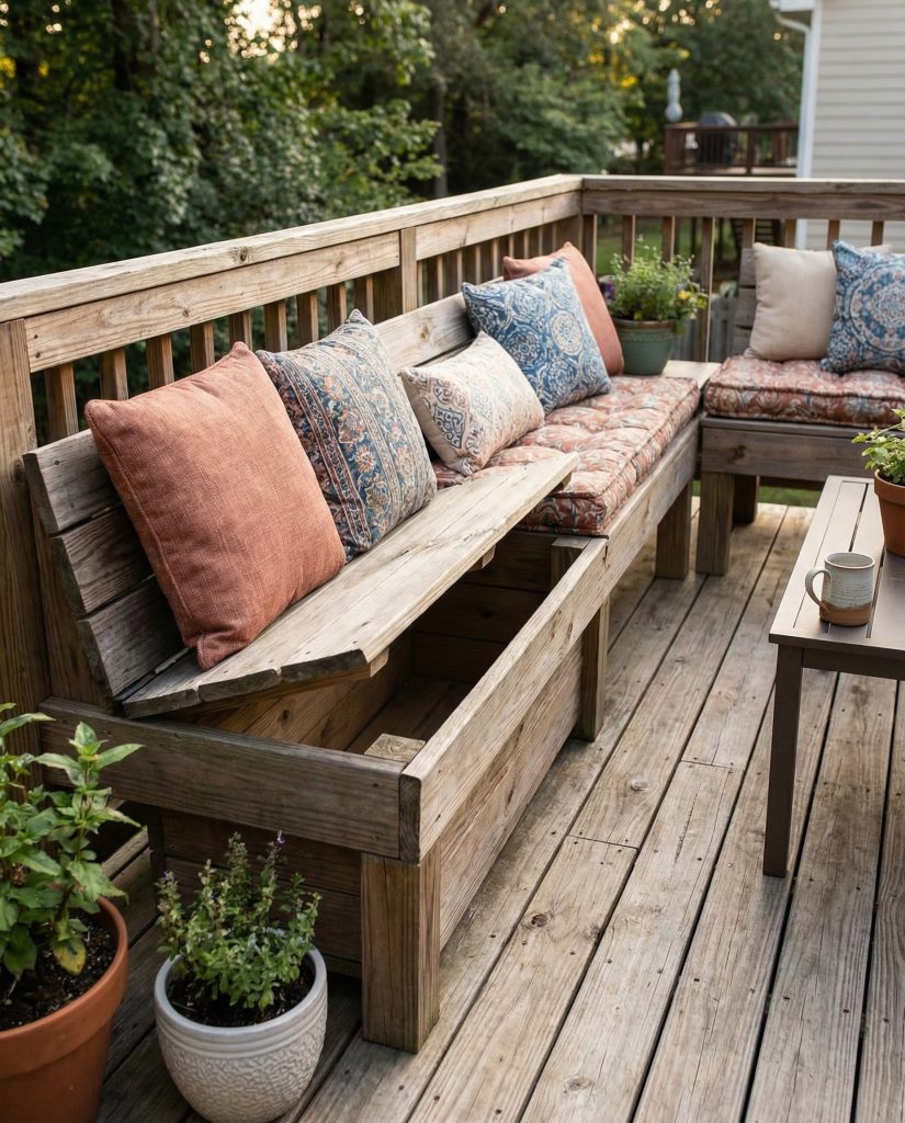 Built-in benches save money on furniture while adding architectural interest to your deck’s perimeter. They define the space naturally, provide seating that never blows away in a storm, and can hide storage underneath for cushions, toys, or grilling supplies. Add a few throw pillows and you have instant decor that feels custom and intentional. L-shaped configurations in corners create cozy conversation nooks, while straight benches along railings maximize seating without eating into walkways.
