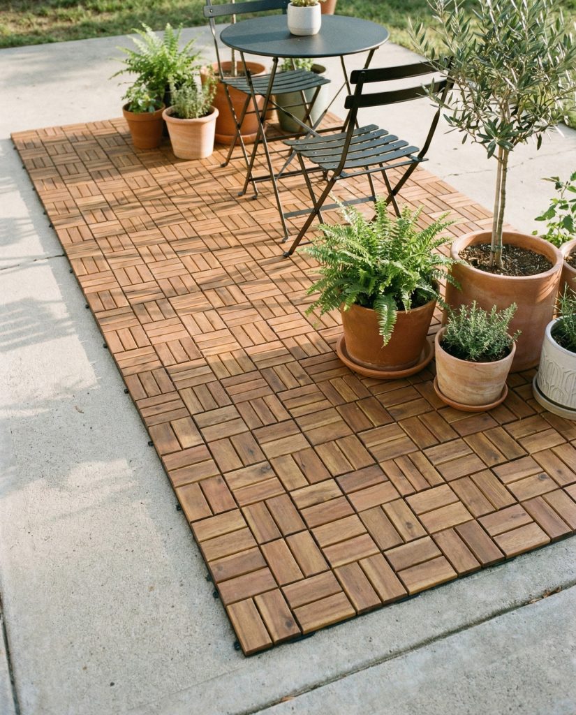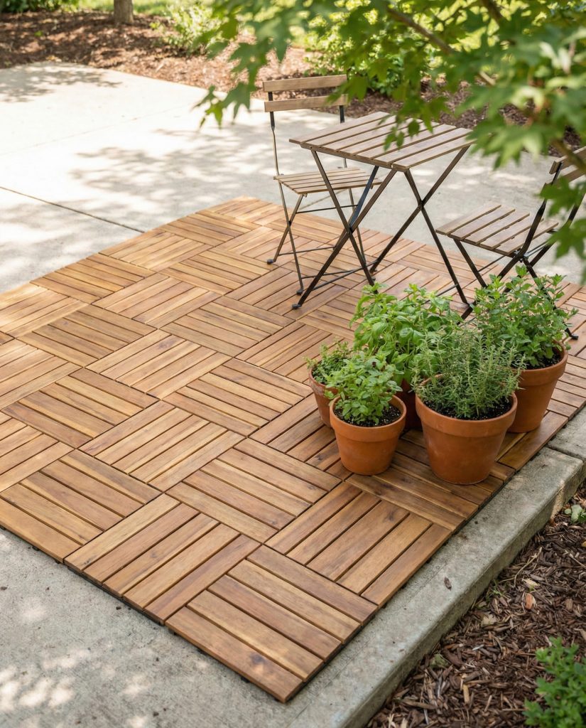 Renters or anyone wanting a temporary solution can transform a concrete patio into a wood deck using interlocking tiles. These snap-together squares (usually 12×12 or 24×24 inches) require zero construction skills—just a level surface and an afternoon. They’re perfect for covering ugly concrete, adding warmth to a sterile space, or defining an outdoor area. When you move, you can take them with you or pull them up at season’s end. Not as robust as a permanent deck, but for a few hundred dollars, it’s an instant upgrade.