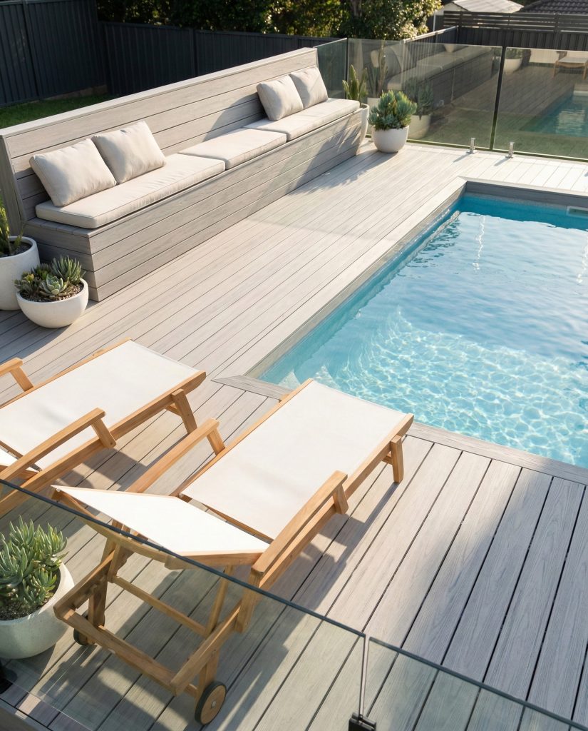 Wrapping your pool with decking creates a resort feel right at home, and built-in benches or lounging areas eliminate the need for bulky pool furniture. Trex or other composite materials work beautifully here—they don’t splinter, they stay cooler than traditional wood, and they handle constant moisture without warping. The key is creating zones: one area for sunbathing, another shaded spot for breaks, and maybe a corner with an outdoor shower or towel hooks.