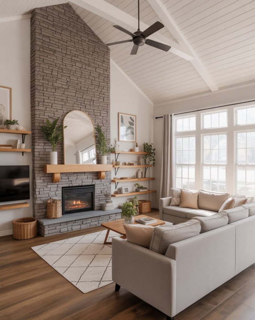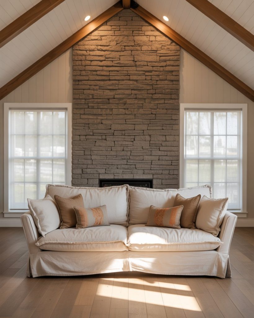 Nothing says timeless like stone on a feature wall, especially surrounding a fireplace. This idea works beautifully in both rustic farmhouse and sleek modern spaces, balancing well in rooms with high ceiling or vaulted ceilings. A deep sectional couch pairs perfectly with the natural texture, creating a cozy yet elevated environment that feels grounded and welcoming.