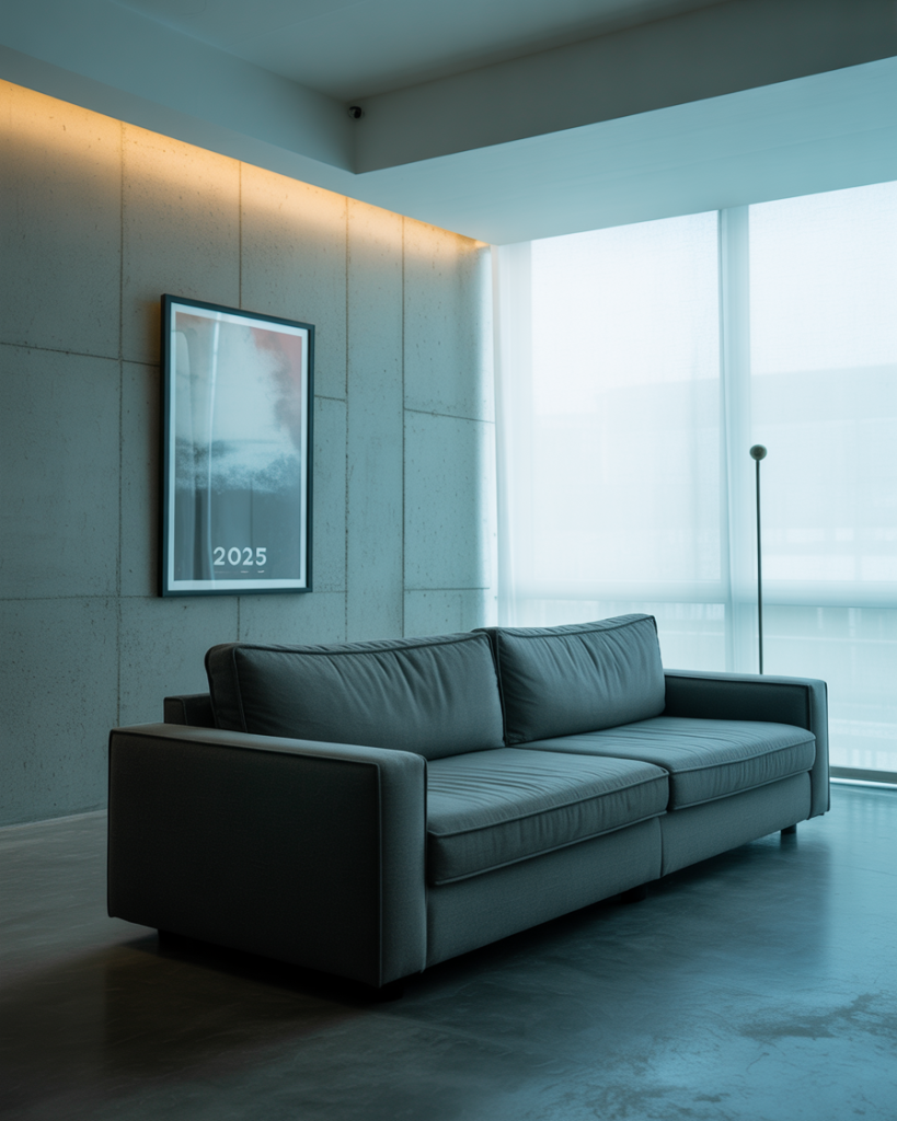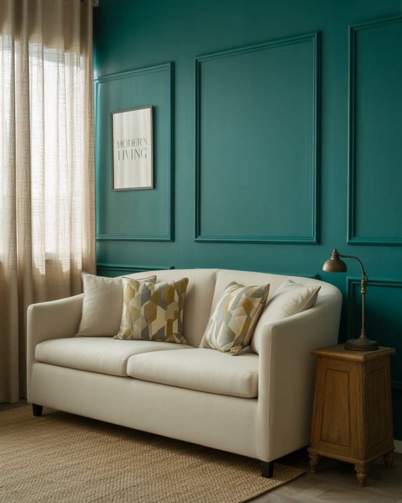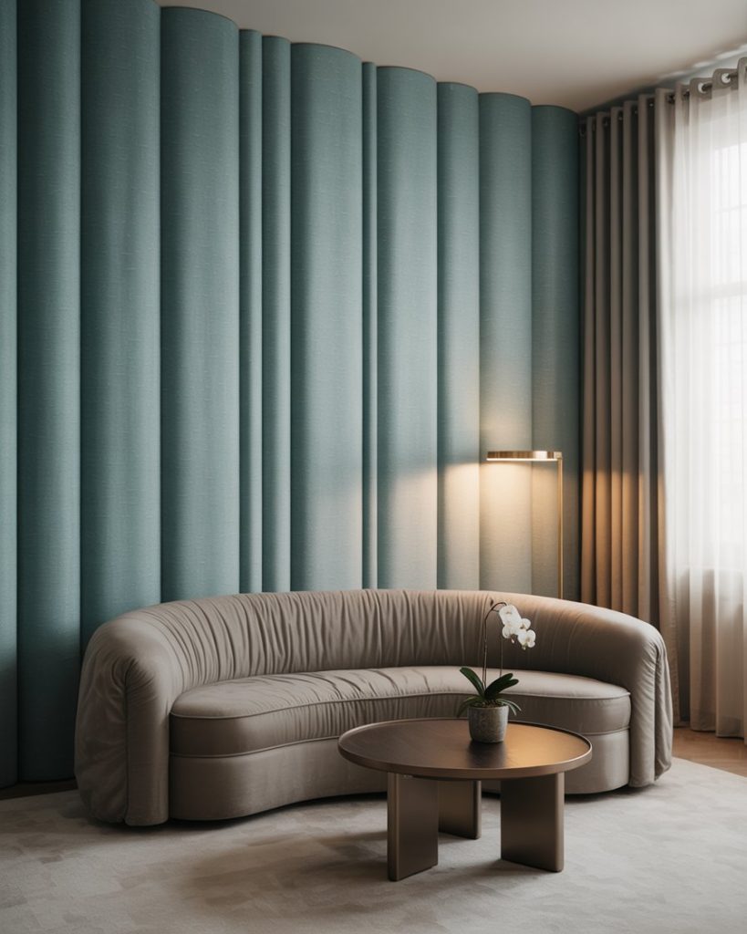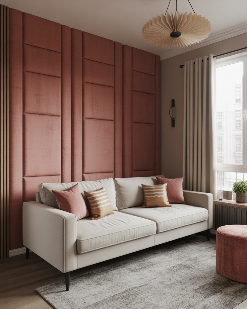 For warmth and acoustic comfort, fabric-covered walls are trending. Linen, velvet, or suede panels in muted colors create a soft backdrop that pairs beautifully with a couch. This idea works well in homes where comfort and decor are the priority.