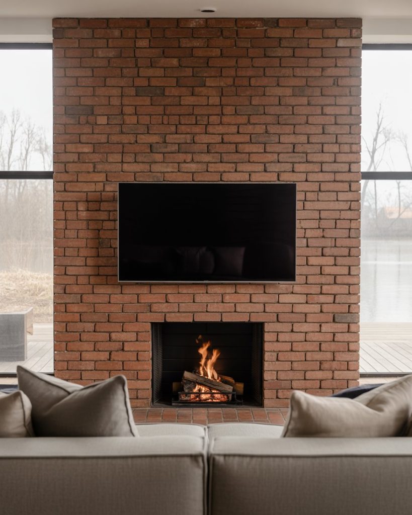Exposed brick is a design classic that never loses appeal. It works perfectly in farmhouse settings as well as loft-style modern homes. The warmth of red brick contrasts beautifully with cool colors and pairs seamlessly with a central fireplace or mounted TV.
