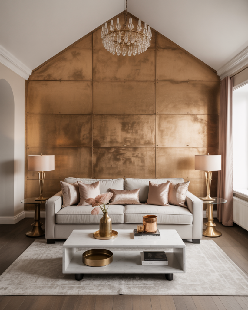 Adding metallic finishes like brushed gold, copper, or silver to an accent wall brings instant luxury. The reflective surface enhances light in rooms with vaulted ceilings, amplifying both size and brightness. Metallics are also trending as an alternative to ideas paint color palettes farmhouse.