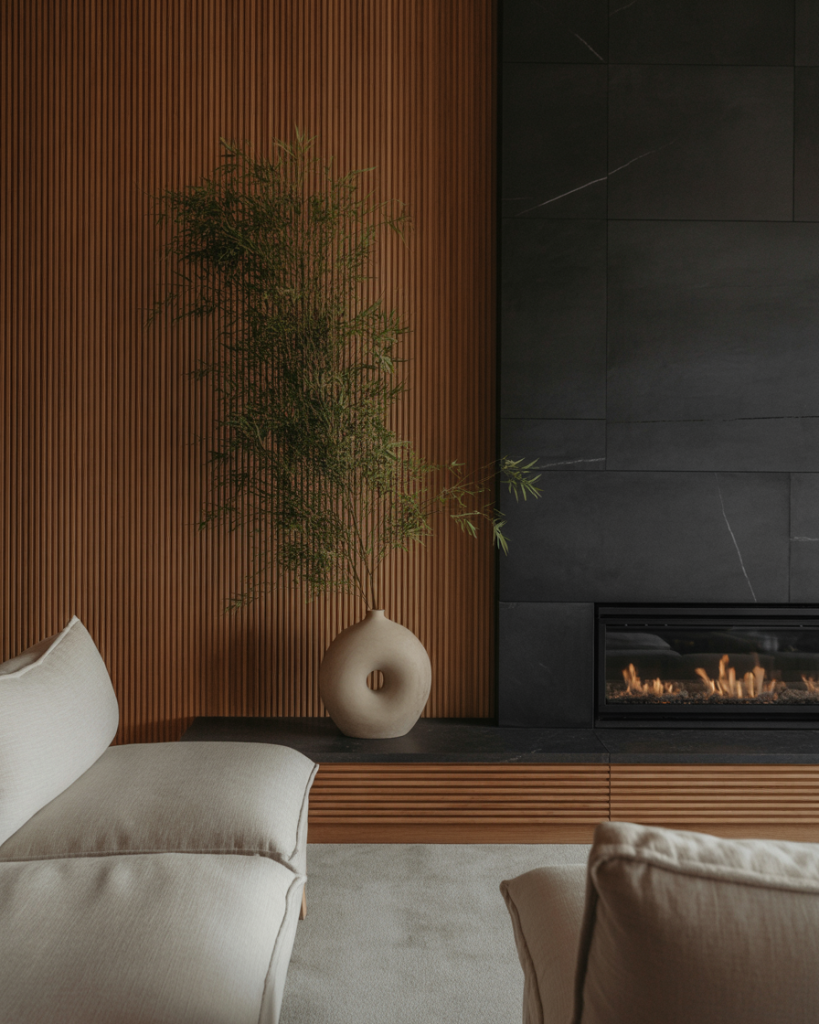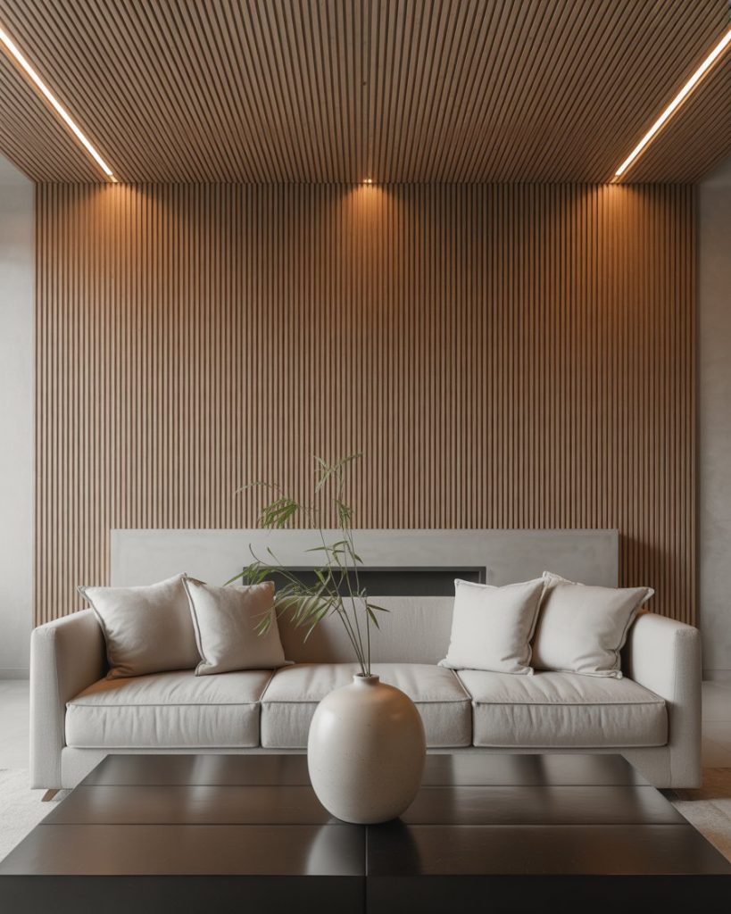 Vertical or horizontal slatted wood panels bring rhythm and structure. These accent walls work beautifully in modern Scandinavian or Japandi-inspired living rooms. The lines elongate spaces, making high ceiling rooms appear even more striking.