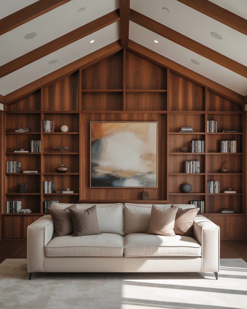 Transform your accent wall into a full-height library with shelving. Painted or stained wood built-ins provide storage while becoming a visual feature. Pair with a ladder in rooms with vaulted ceilings for a timeless, intellectual aesthetic.