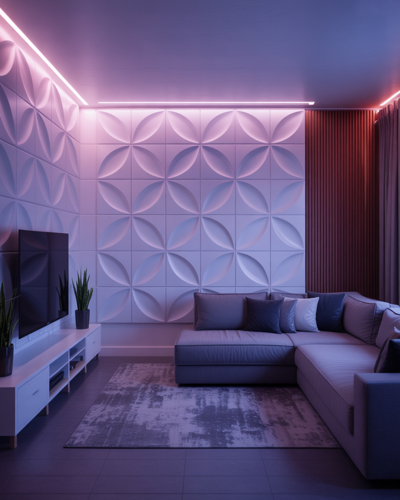 Integrating LED strips or backlighting into an accent wall adds futuristic atmosphere. Perfect for highlighting painted, textured, or 3d surfaces, lighting turns the wall into a glowing statement, especially behind a TV or entertainment setup.
