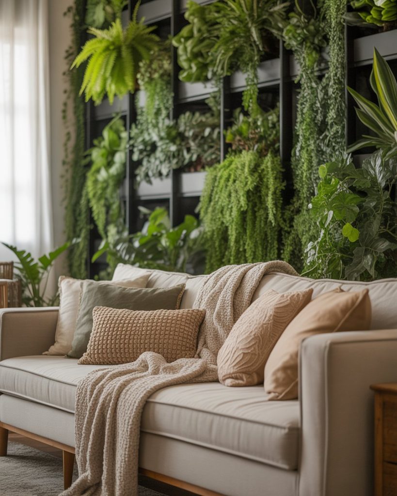 A vertical garden wall filled with greenery is the ultimate statement for nature lovers. Living plants bring fresh air, bold colors, and texture, while making your living room feel alive. This idea pairs beautifully with boho or farmhouse decor.