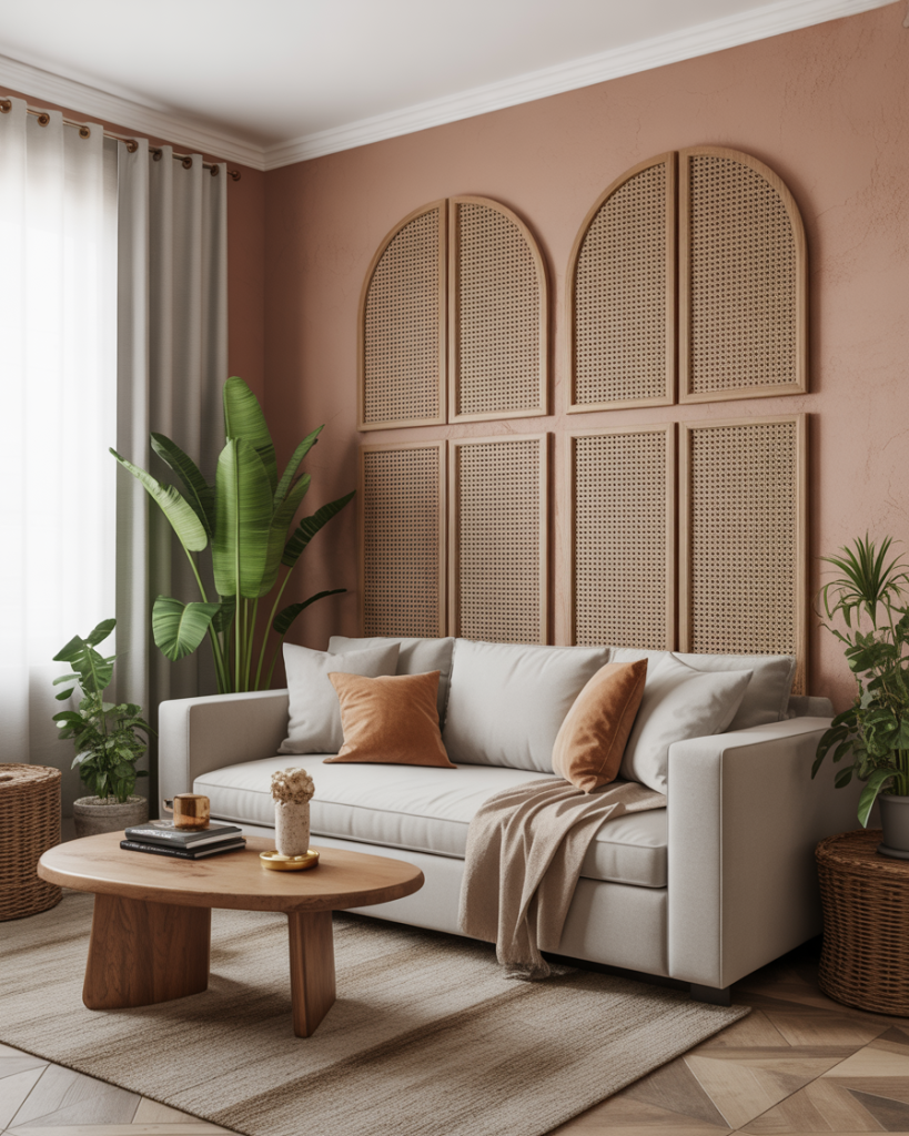 If your style leans boho, try a textured accent wall using rattan, woven panels, or 3d wall art. Placing this feature behind a couch or shelving adds visual richness and warmth. Justina Blakeney, author of The New Bohemians, often notes that layered textures make a space feel inviting and personal, which is exactly what this idea achieves.