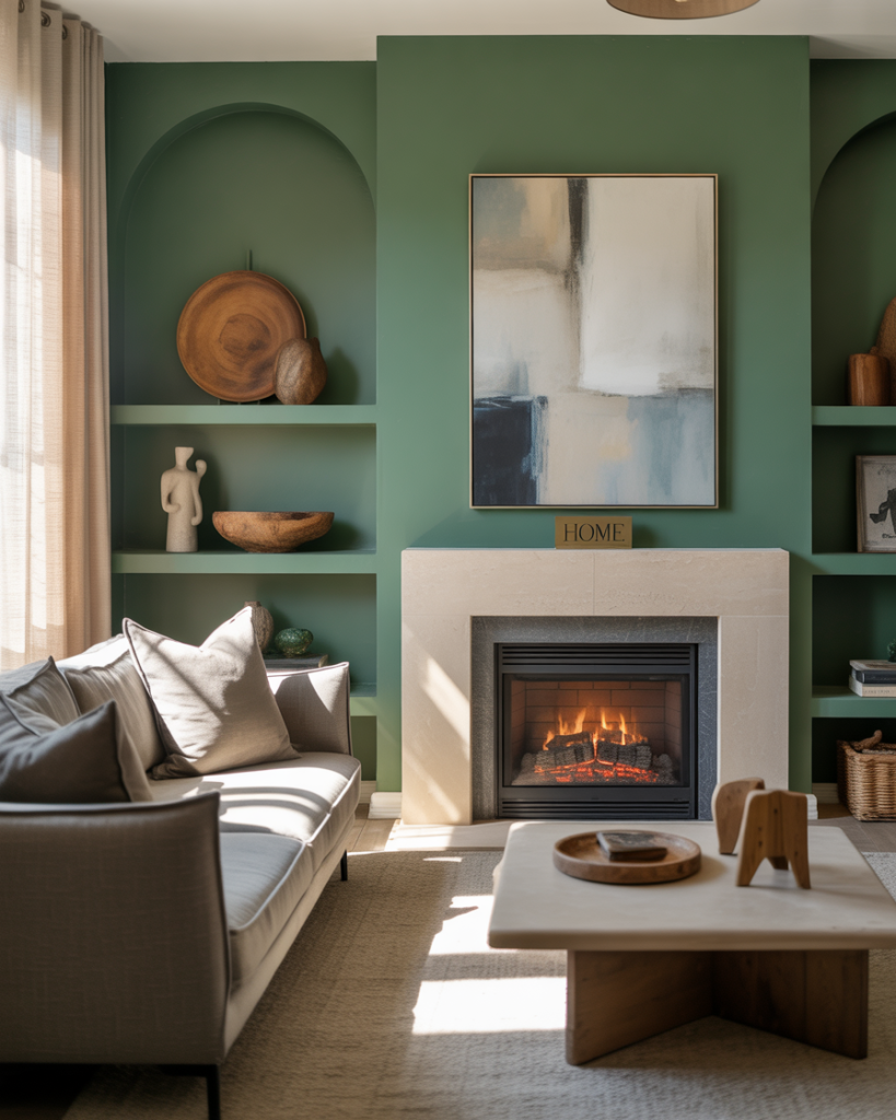 A green accent wall brings the tranquility of nature indoors. This color works well behind the TV, next to a fireplace, or alongside wood furniture. From sage to deep forest tones, green blends seamlessly into both modern and farmhouse designs. Many homeowners say the shade makes their living space feel fresh and rejuvenated, like a calming retreat.