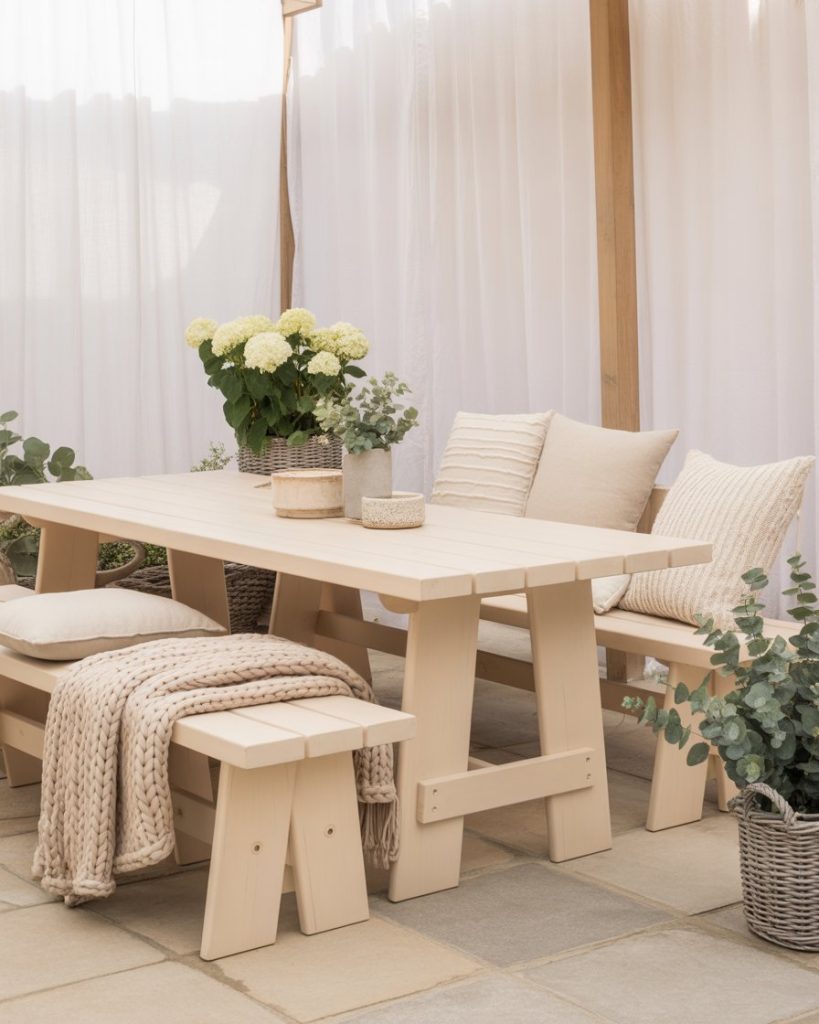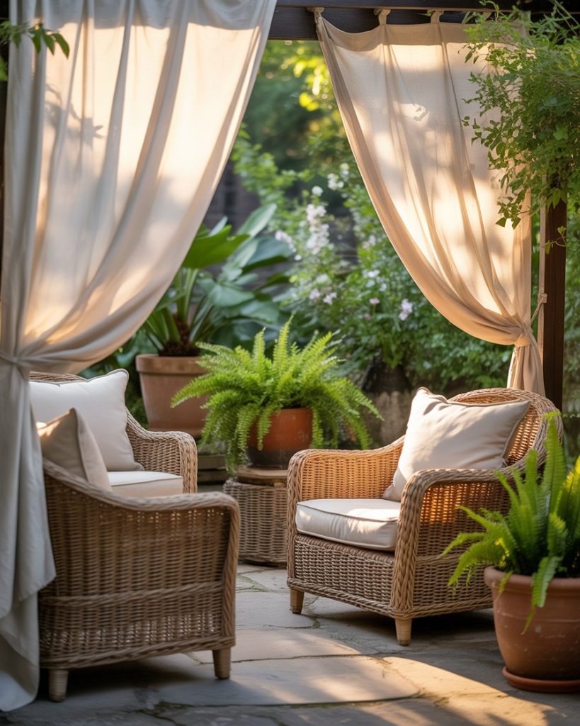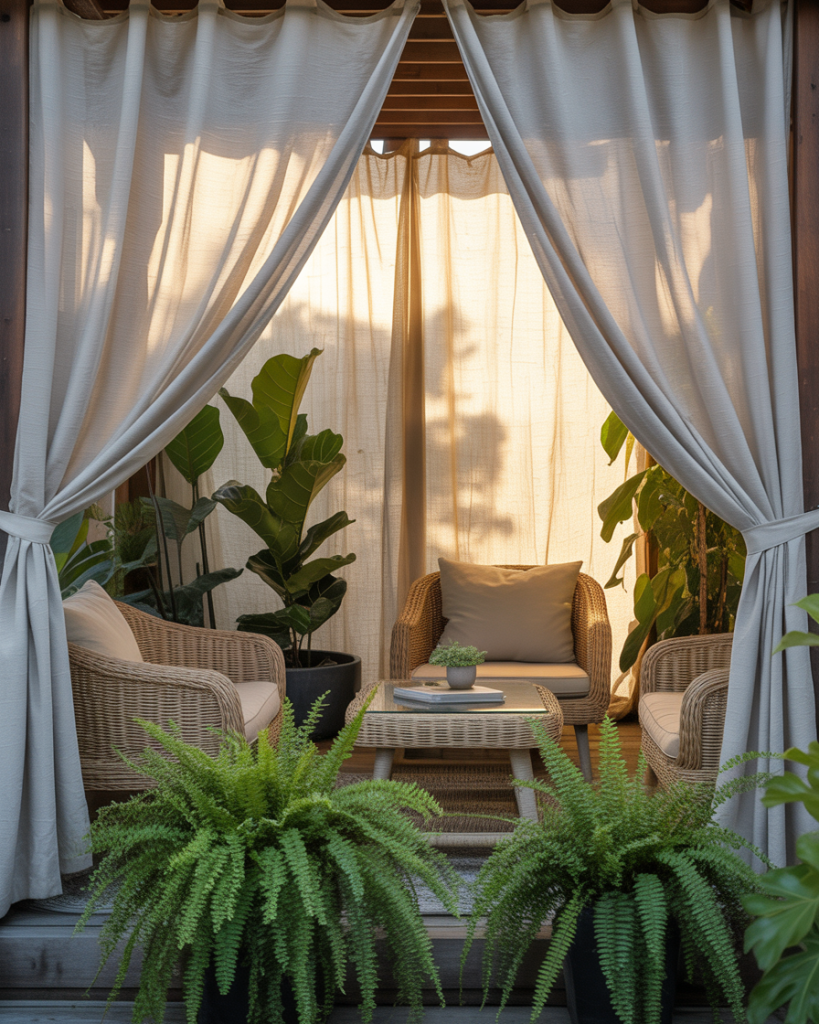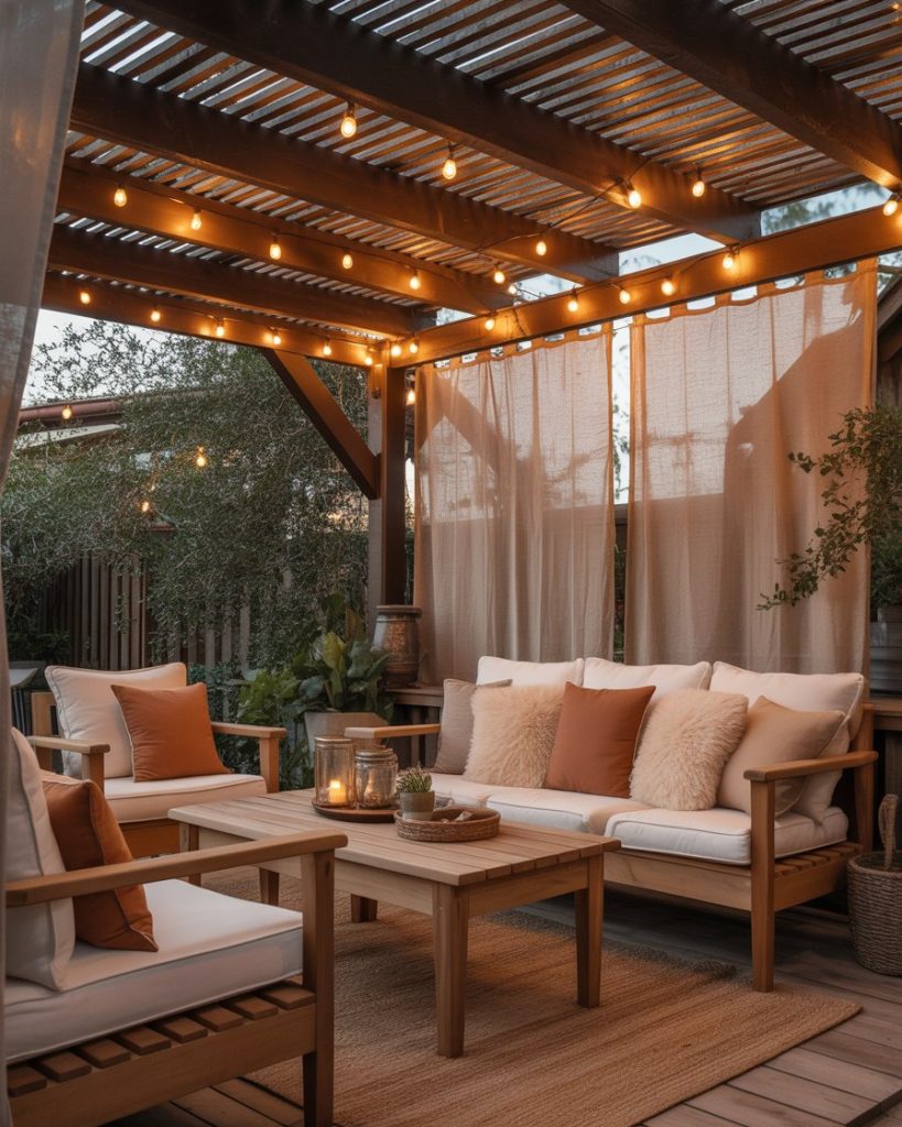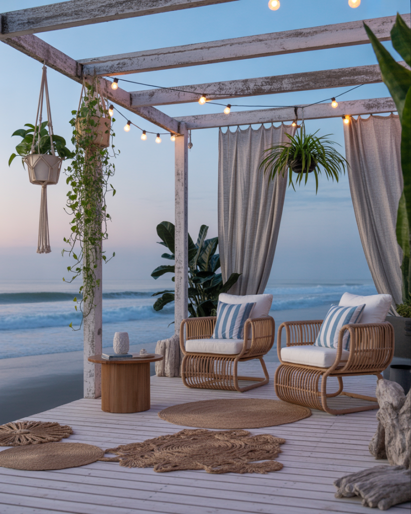 Blend Boho ease with coastal freshness. Use rattan chairs, striped pillows, and white curtains for that breezy seaside vibe. This budget DIY outdoor areas concept works for both tiny and large patios. Add seashell accents or driftwood art for character.