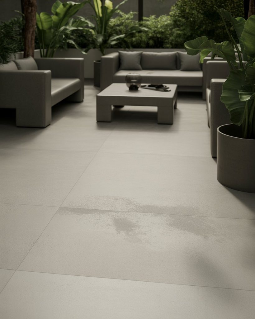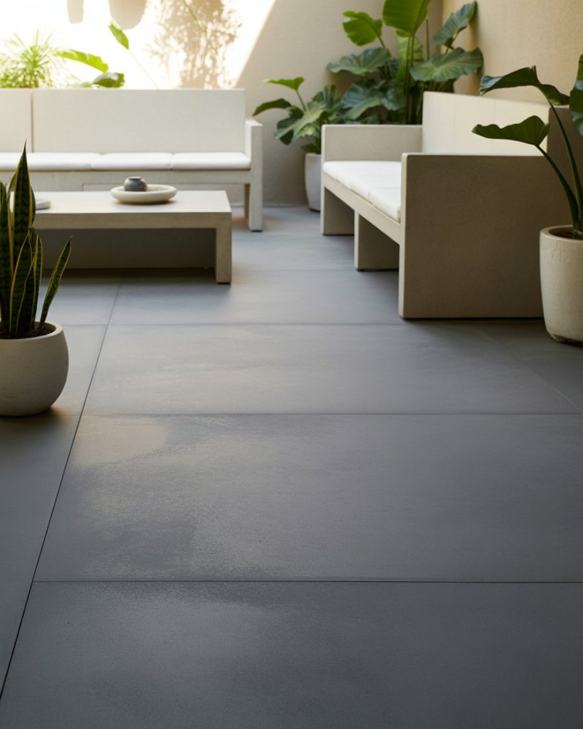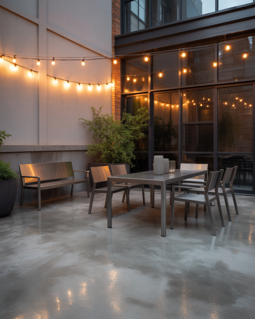 A concrete patio offers a sleek, modern look that’s easy to maintain and perfect for a budget. Pair smooth surfaces with minimal furniture and greenery for warmth. This design suits narrow layouts or small covered patios, especially in urban homes. Designer Emily Henderson praises this style for blending simplicity with sophistication.