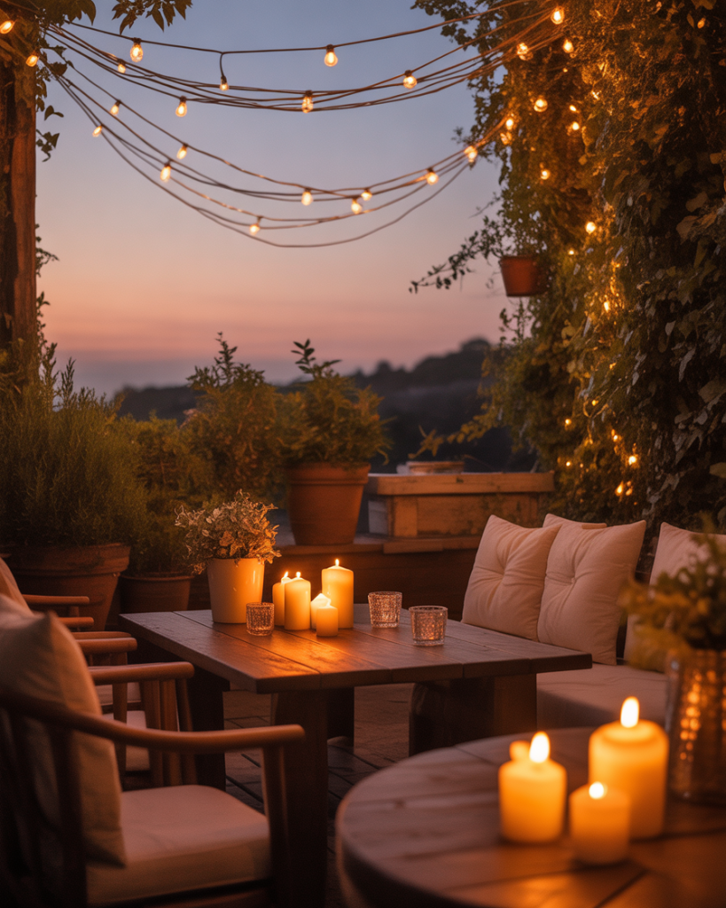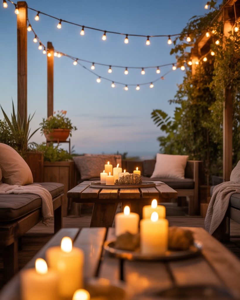 Sometimes, all you need is the right light. Draping string lights across your covered porches or pergola instantly adds magic. Combine cheap lanterns, fairy lights, and candles for a layered glow. It’s a budget DIY deck decorating trick that turns ordinary nights into celebrations.