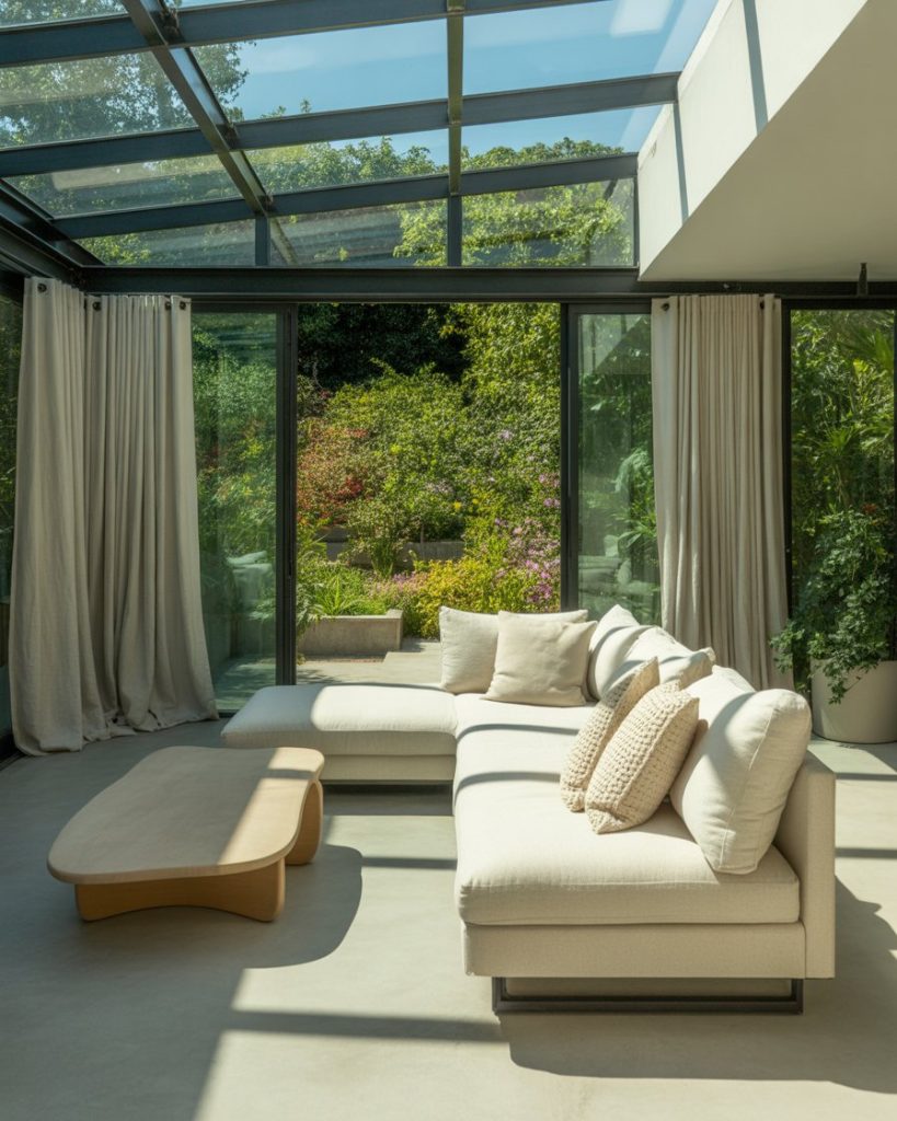 A screened-in or glass-enclosed patio creates luxury and comfort all year long. Use concrete floors, cozy seating, and soft drapes. For a budget, consider transparent vinyl panels for insulation. It’s elegant yet practical, keeping warmth in during cool months while offering panoramic garden views.