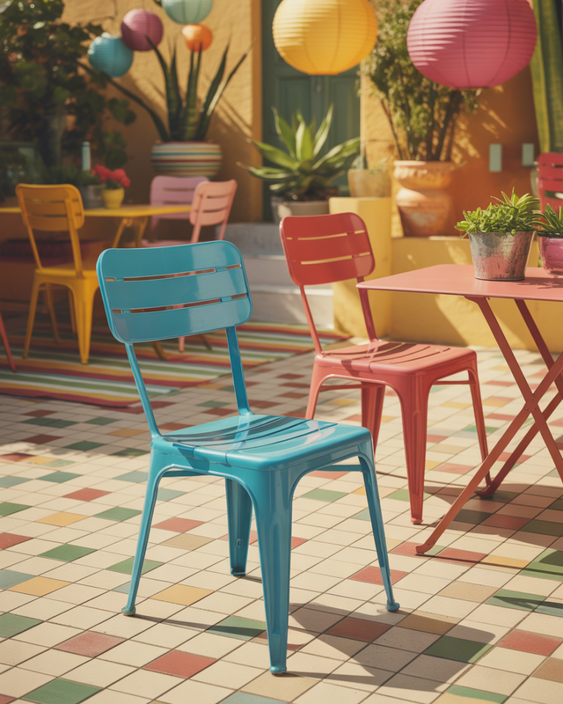 Retro style is making a comeback with bold colors and nostalgic details. Perfect for a budget DIY deck decorating outdoor makeover, use metal chairs, checkerboard tiles, and colorful cushions. Even in small covered patios, this design feels playful and full of life.