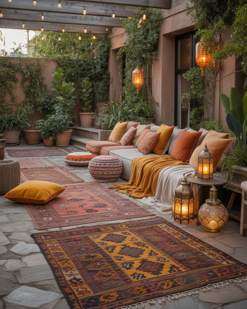 The boho style celebrates freedom and relaxation. Using a budget DIY outdoor area idea, combine colorful rugs, lanterns, and floor cushions. This look works beautifully for tiny patios or apartment balconies. It’s simple yet soulful, evoking the warmth of global inspiration in a personal setting.