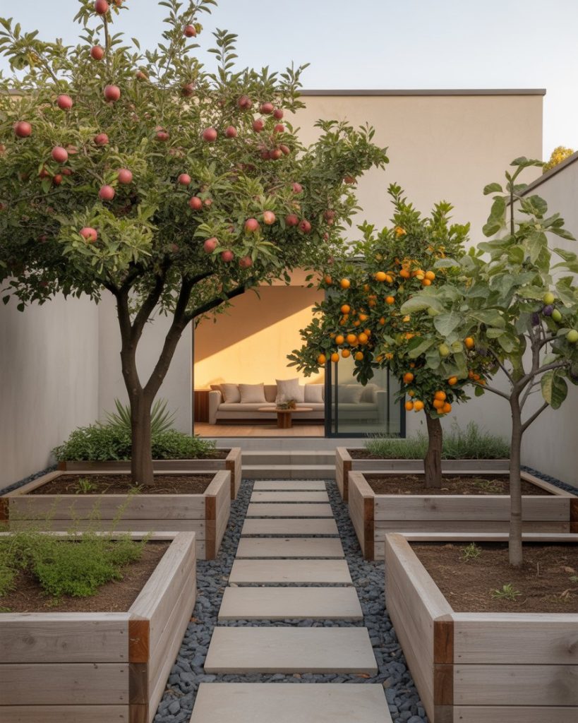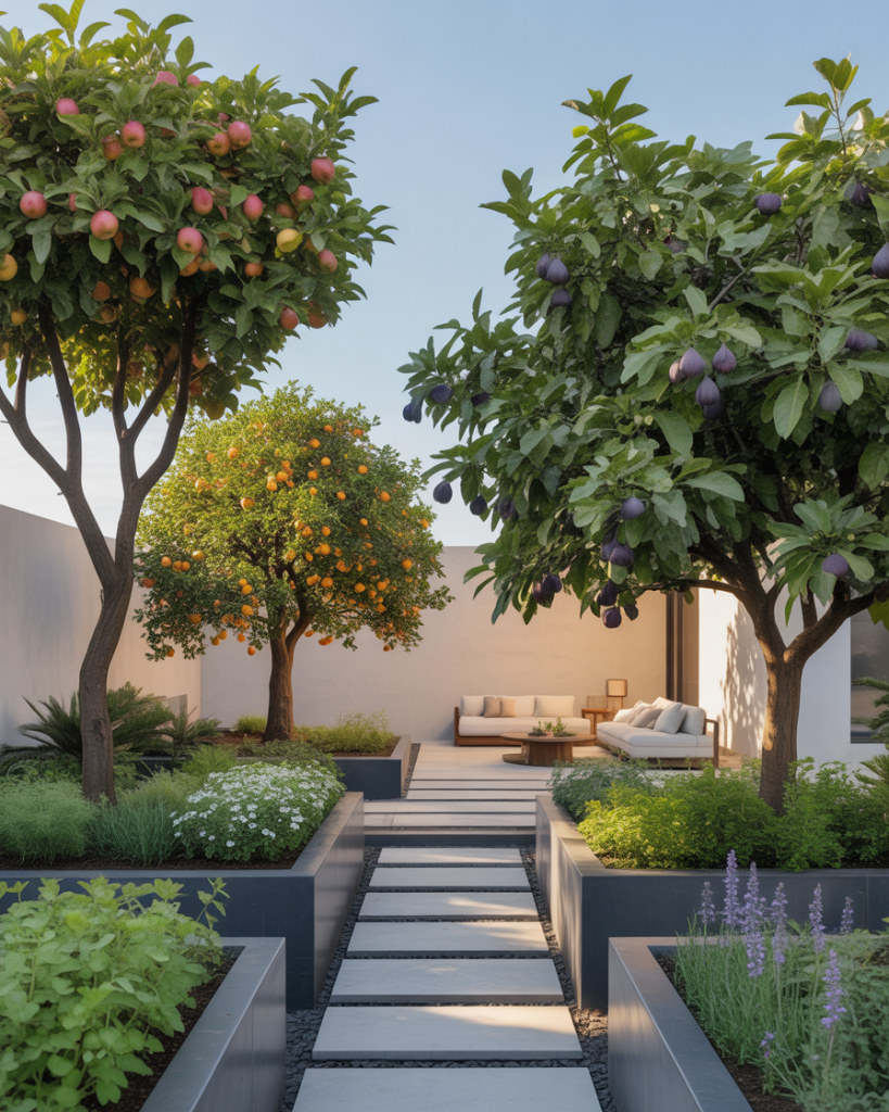 Finally, planting fruit trees is becoming one of the most rewarding landscaping choices. They bring beauty, shade, and homegrown harvests to any yard. This idea works well in both large and small plans, with dwarf trees thriving in compact areas. In California, citrus trees dominate; in Arizona, figs are rising in popularity. Add raised beds or DIY trellises and you’ll have a productive garden that feels natural, personal, and distinctly 2026.
