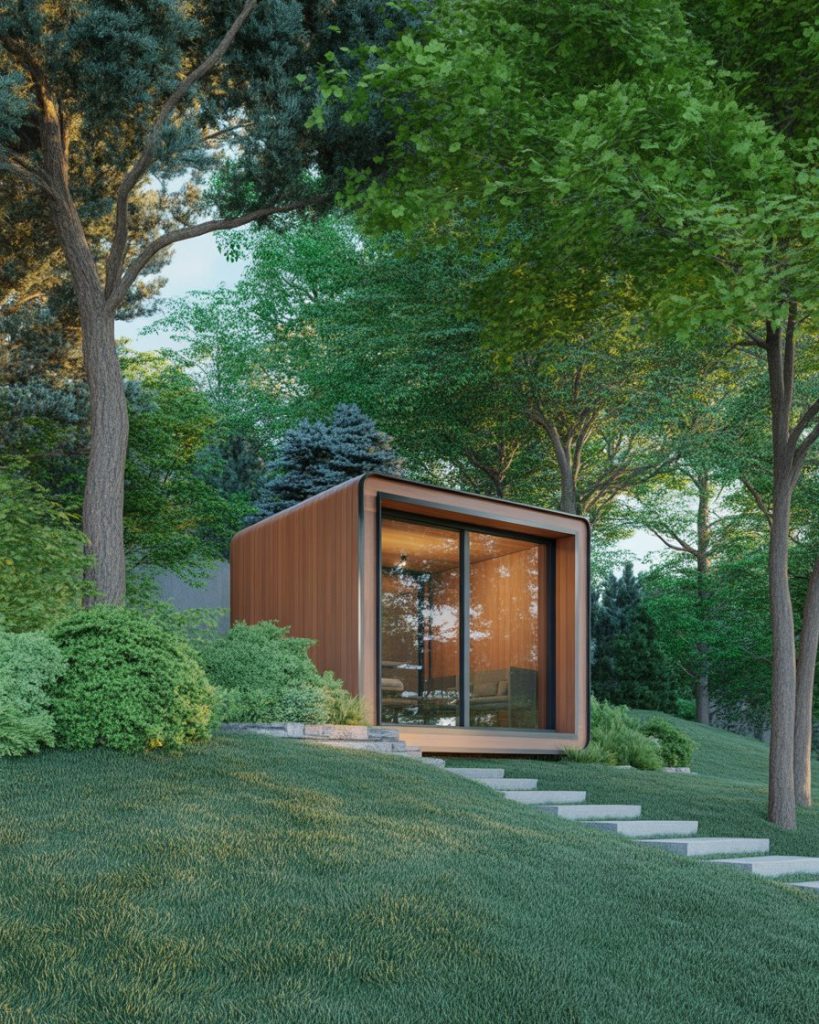 Since remote work is here to stay, backyards in 2026 are getting small office pods built into plans. Surrounded by greenery, these modern pods let you work in peace while still being close to home. Adding sloped or wooded landscaping around the structure makes it feel like a retreat instead of just an office. These pods can be DIY projects or professional builds, making them doable on a budget.