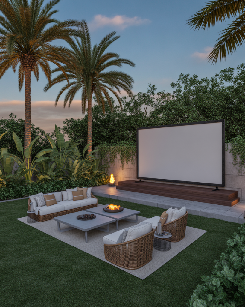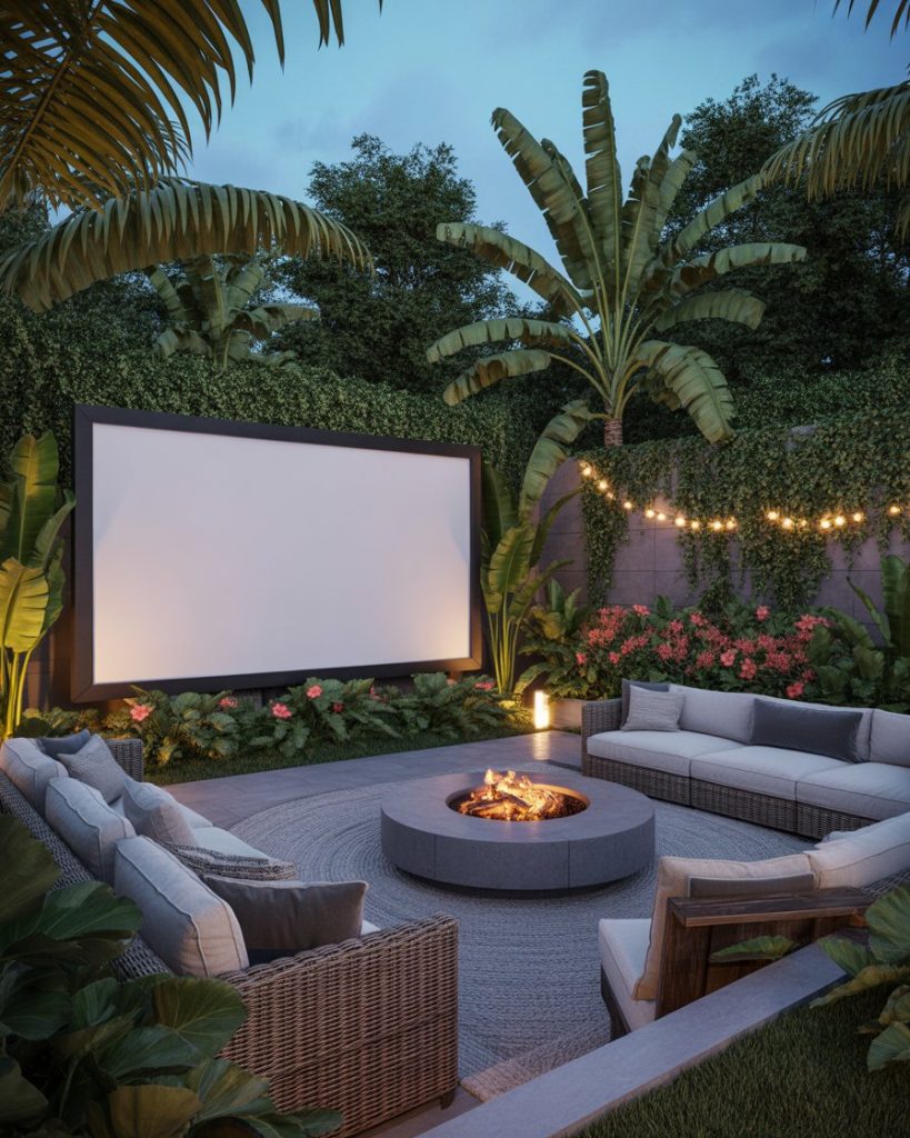 Technology and landscaping now meet in backyard movie setups. Large screens, built-in seating, and surrounding wooded or tropical plants make outdoor film nights unforgettable. This modern idea is surprisingly simple to create with projection tech that works on a budget. Pairing the theater with firepit ideas or even a pool gives families endless summer entertainment right outside their back door.