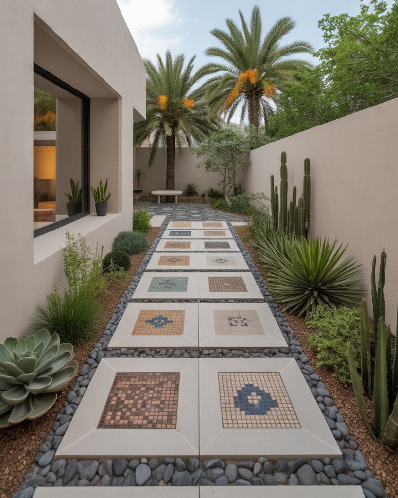 Even pathways are turning into statement pieces in 2026. Using mosaic tiles, colored concrete, or engraved stone, homeowners are turning basic walkways into art. These designs layout are low maintenance, dog proof, and make any space feel instantly modern. Combined with tropical or desert planting, they highlight the personality of the home. It’s one of the most affordable ideas that delivers maximum visual impact.