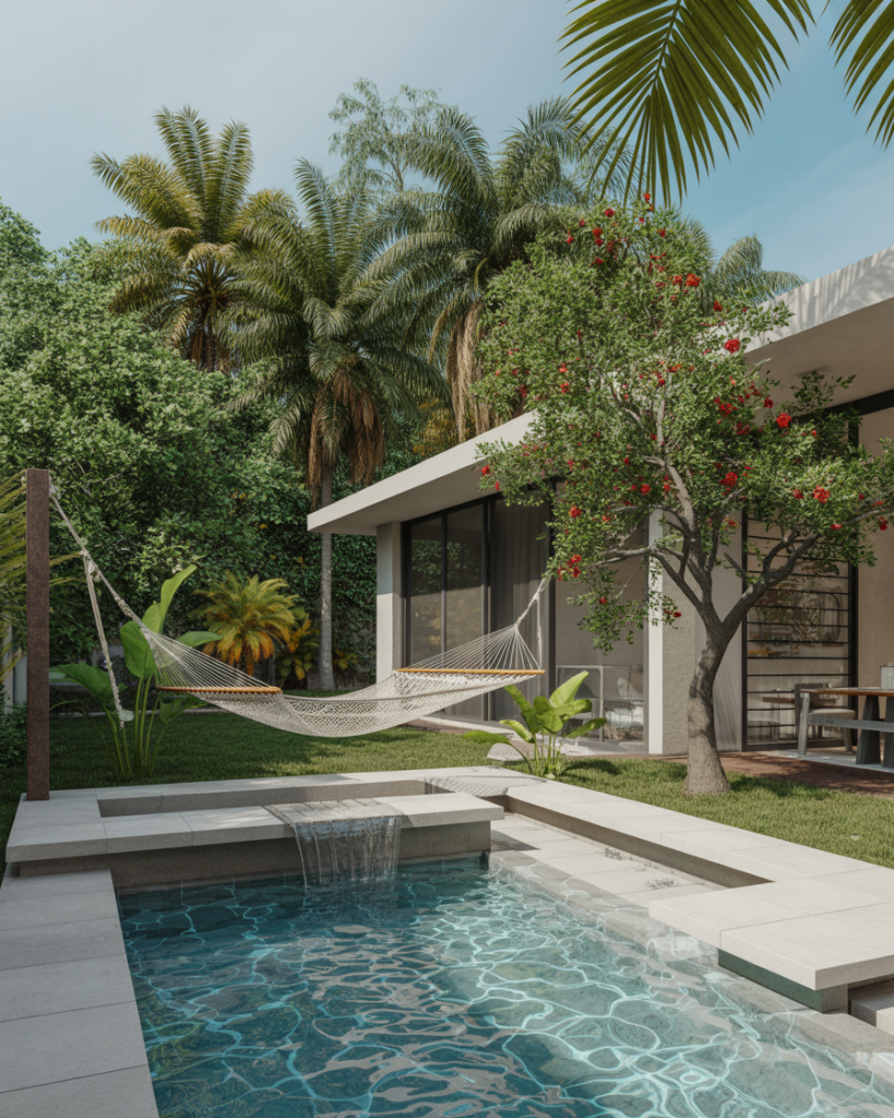 Nothing says vacation like a tropical backyard. Homeowners in 2026 are planting fruit trees, palms, and banana plants to create a lush escape. Adding a pool or waterfall takes the look further, turning an average yard into a private resort. This style works in both large and small spaces, blending contemporary structures with natural greenery. It’s one of those ideas that makes every day feel like a holiday without ever leaving home.