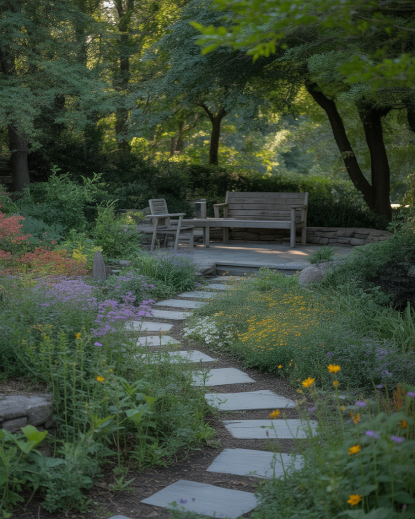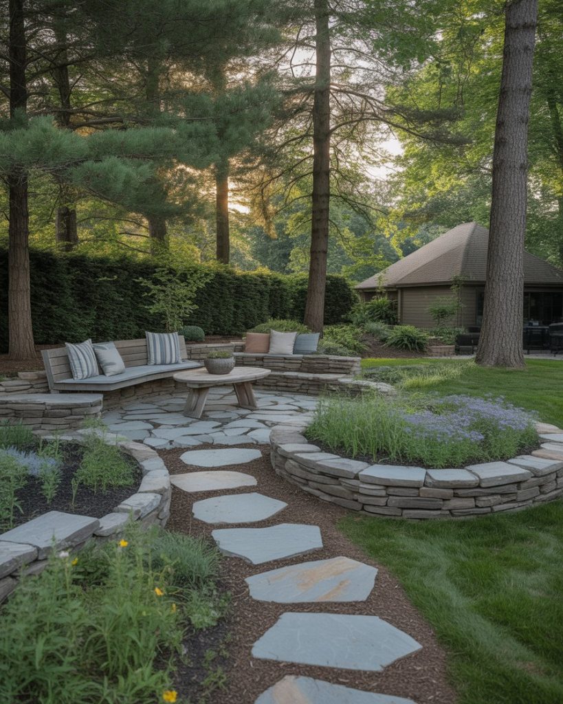 For those who crave peace, a wooded backyard sanctuary is one of the most soothing 2026 ideas. Using natural stone walkways, shady benches, and pockets of wildflowers, you can design a retreat that feels far removed from suburbia. It’s a simple and low maintenance option, letting part of the yard grow freely while shaping a few cozy sitting areas. This is especially loved in rural or semi-rural areas where nature is the main luxury.