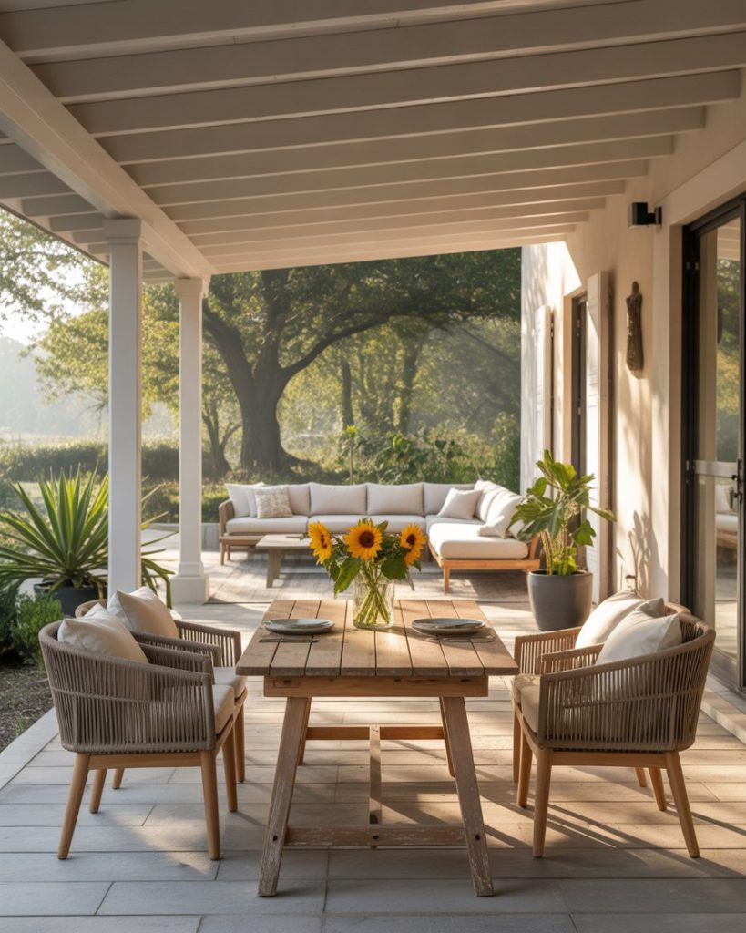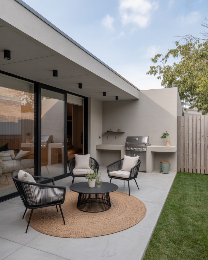 An open patio design maximizes sunlight and fresh air. With a clear layout grill area, simple furniture, and no overhead cover, it’s the perfect setup for barbecues and summer parties. While it doesn’t provide shade, I once saw a clever mix of umbrellas and moveable screens that made an open patio flexible and stylish.