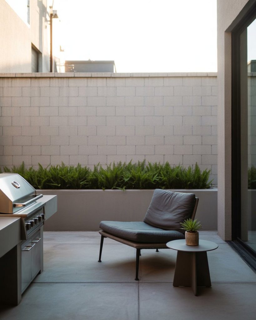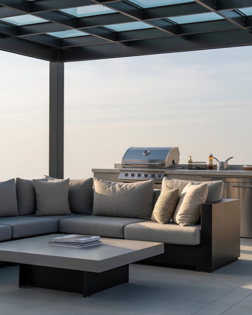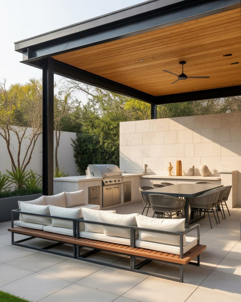 A covered modern lounge patio creates a sleek, stylish space with weather protection. Using clean lines, neutral tones, and comfortable furniture, you can craft a sophisticated retreat. Paired with a layout grill area or small kitchen, it’s functional as well as beautiful. I once admired a sleek lounge that felt like a hotel rooftop but in someone’s backyard.