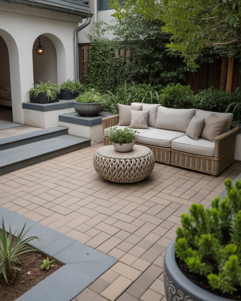 Combining hardscape ideas like stone pavers with a water feature creates a serene atmosphere. Whether it’s a fountain, pond, or small stream, the sound of water adds peace to your patio layout. A friend of mine built a small DIY fountain, and it instantly turned their backyard into a tranquil retreat.