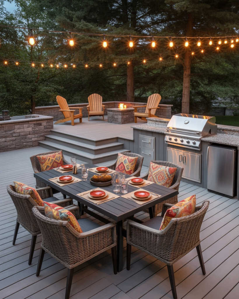 A multi-level deck adds depth and functionality to your yard. One tier can host a kitchen or grill, another a fire pit or seating. This layout makes the most of sloped yards or larger spaces. A designer I follow often recommends this for breaking up large patios into intimate zones—it works beautifully.