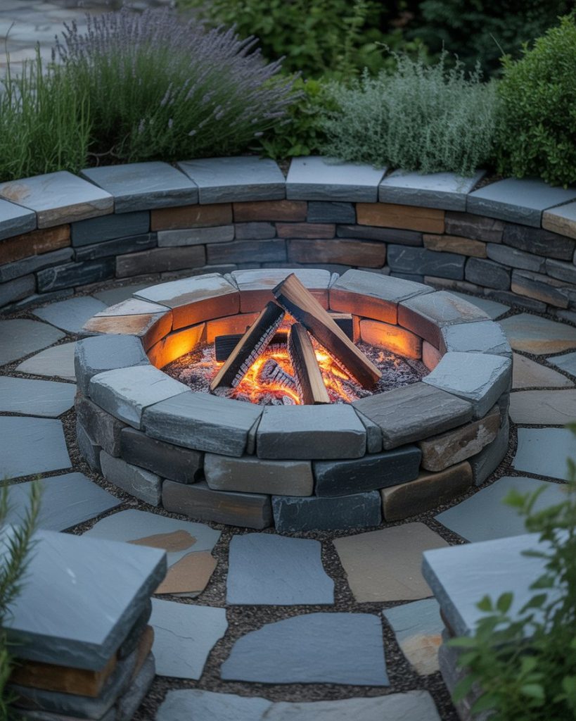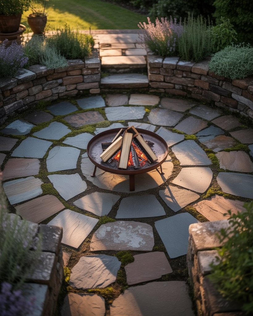 A rustic stone patio layout embraces natural beauty. Using flagstone or rough pavers, combined with a fire pit or garden borders, it creates a timeless look. This style works in both small yard and larger spaces. I once stayed at a countryside rental with such a stone patio, and it blended seamlessly into the landscape.