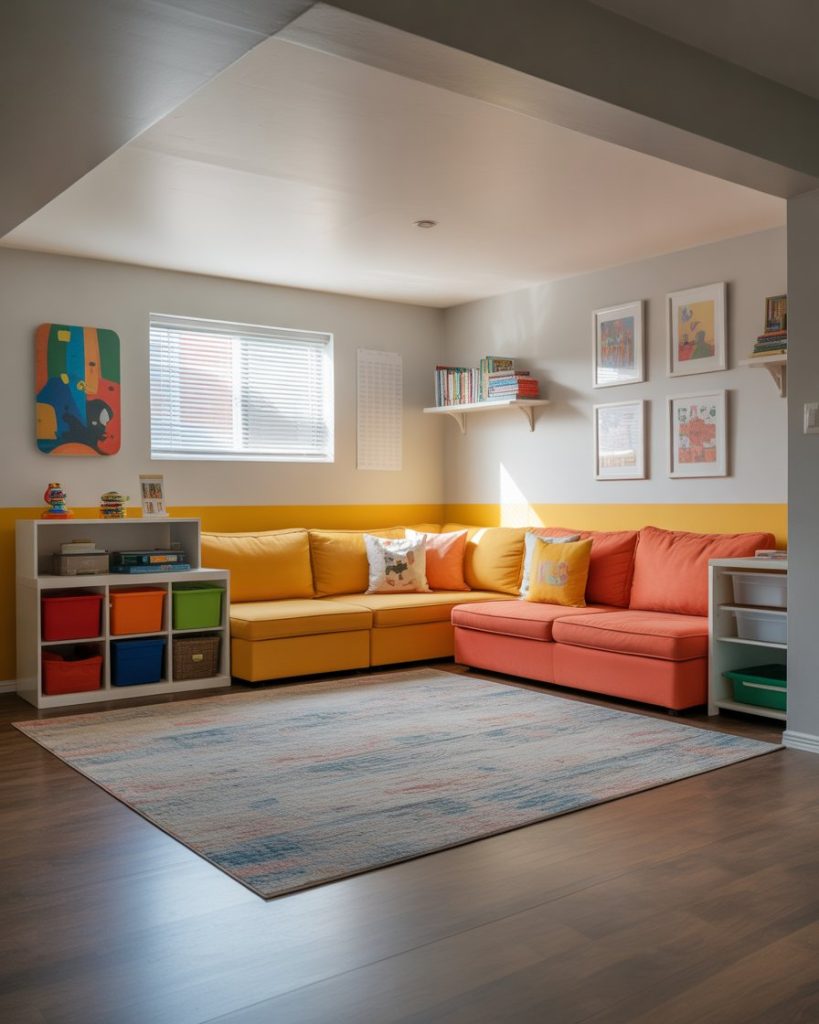 A basement playroom is a cheap and easy way to free your main living spaces from toy clutter. With soft rugs, colorful furniture options, and built-in storage solutions, kids get a safe and fun place of their own. Washable paints and bright color palettes add energy, while parents enjoy having the rest of the home more organized. As blogger Emily Henderson often notes, a playful basement makes family life more balanced.